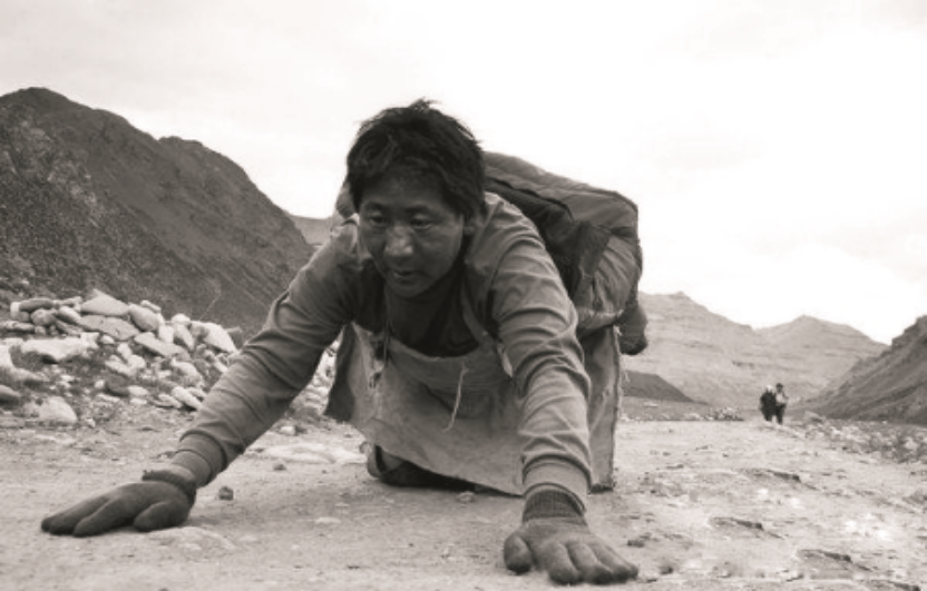 在寺庙外、大路旁,常常见到虔诚信徒的身影。他们用废旧轮胎的橡胶制成简易的护手护膝,风餐露宿中不惧艰难,不惜千里跋涉;以身体为尺,一步一叩,丈量着漫长的朝圣之路,凭坚强的信念执着地走向心中的圣地。
