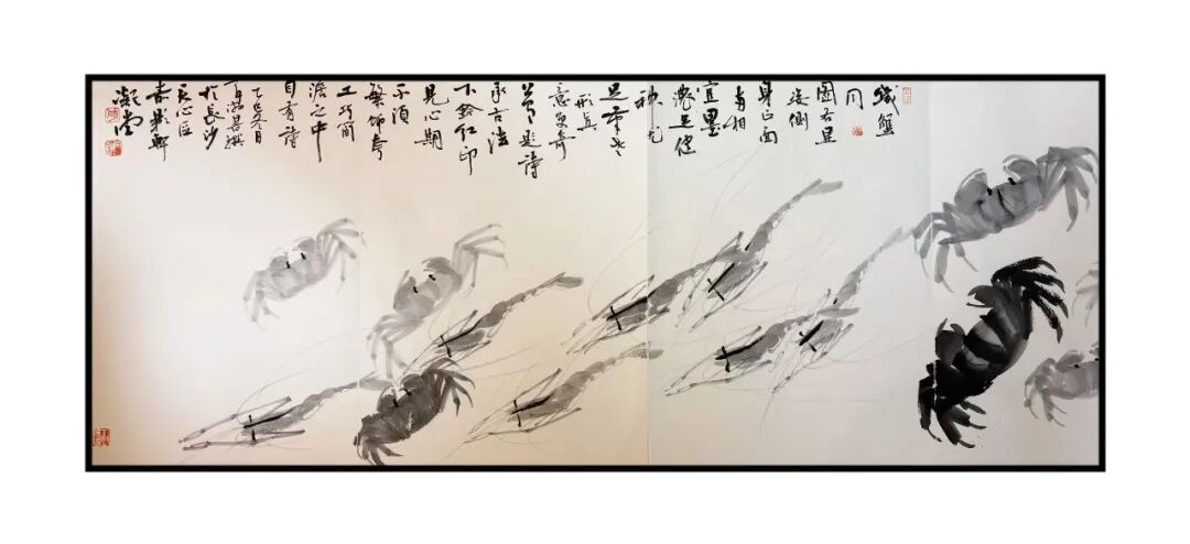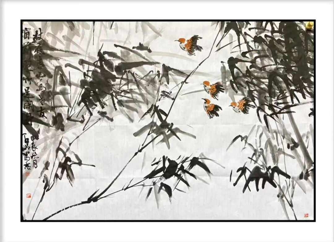 在“数学与书法的最高境界是哲学”的理念的主导之下。李再湘的书法以豪放写意、气势磅礴著称。而今在进行水墨画创作时,他倾向于写意而非工笔风格,注重笔墨的气韵与抒情的张力。他注重书法作品的空间布局与结构感。这源于其数学专业背景,在水墨画构图中同样讲究理性的空间分割与几何美感。他擅长在书法中融入个人创作的诗词佳句,在作画时,也追求 “诗书画”一体的文人画风貌,使画作富有文学底蕴和思想性。他的画作不局限于物象描绘,宗尚“白石先生的在象与不象之间”的理念,追求表达哲理、心境和自然的宇宙观。在水墨作品中突出浪漫豪放的写意书风;强调挥洒自如、墨色淋漓、动势姿态与感染力,让作品充满生命张力与运动美感。将数学的黄金分割与几何构形融汇其中;讲究画面的正斜开合、虚实相生。达到构图隐含严谨的数学比例;注重画面空间的节奏、对比与平衡。