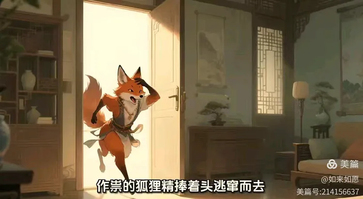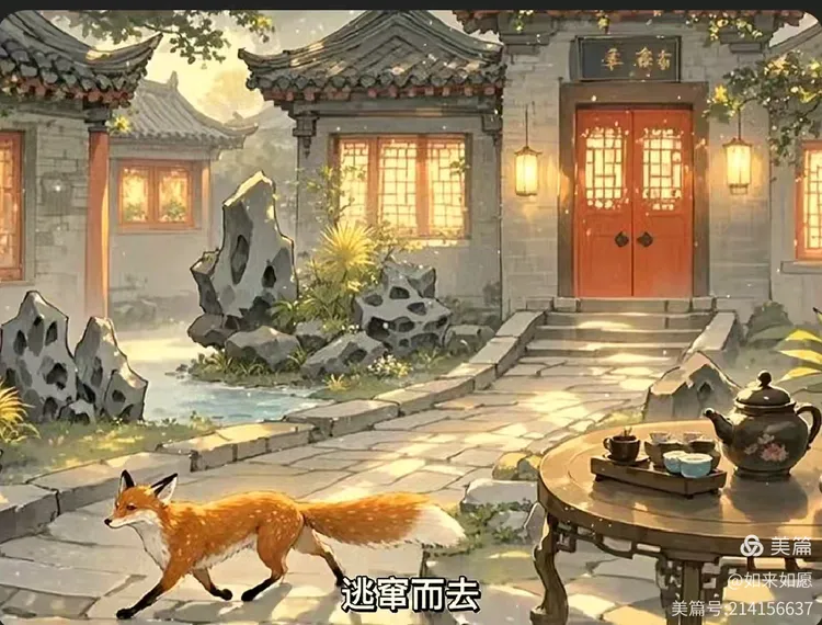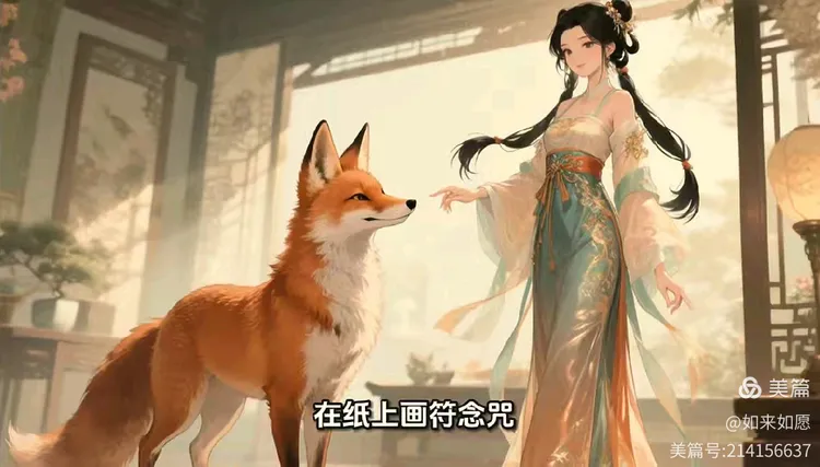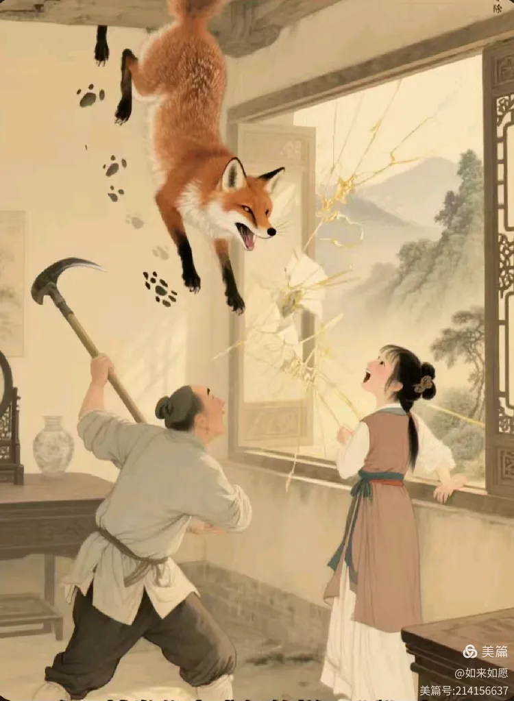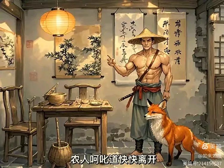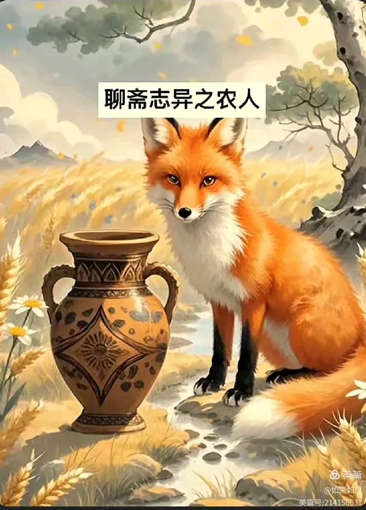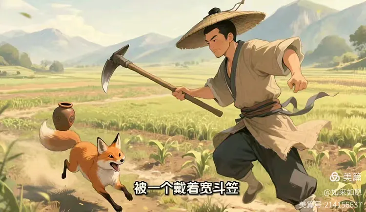 日日耕耘妻送餐,狐狸偷粥,农父心烦。荷锄击打兽惊慌。碎罐脱头,越岭而潜。 修炼成精缠贵媛。不惧神符,得意狂巅。农人装扮厉声呵。哀乞奔逃,自此平安。