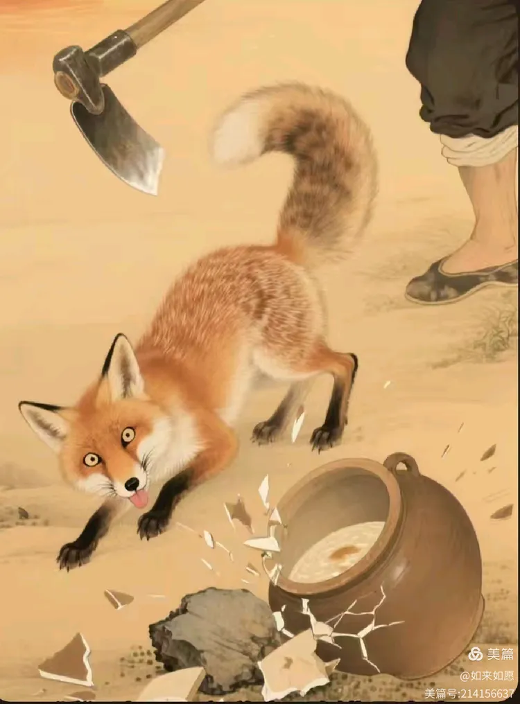 偷粥狐狸受锄打,终将惧怕记心怀。