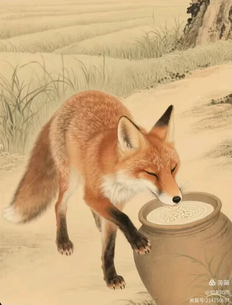 垄畔余粥屡荡失,窥狐探首正偷食。