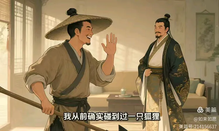 会仆以故至山村,向人偶道。旁一人惊曰:“此与吾曩年事适相符,将无向所逐狐,今能为怪耶?”仆异之,归告主人。主人喜,即命仆持马招农人来,敬白所求。农人笑曰:“曩所遇诚有之,顾未必即为此物。且既能怪变,岂复畏一农人?”贵家固强之,使披戴如尔日状,入室以锄卓地,咤曰:“