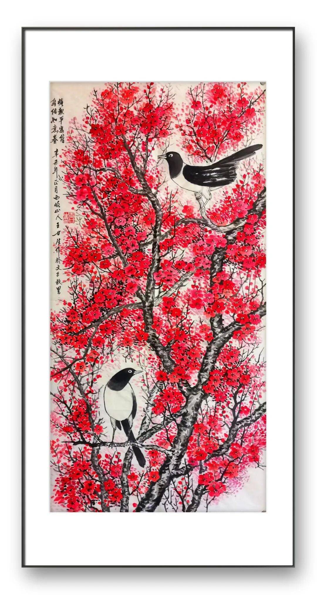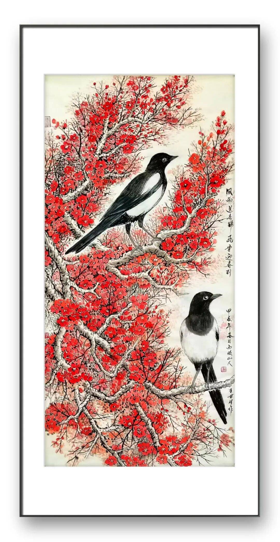 王甘生老师的喜鹊登梅系列作品,以浓艳热烈的红梅为底,灵动传神的喜鹊为魂,在传统花鸟画的范式中注入了西北画者的雄浑气质与人文温度。他笔下的红梅摒弃了文人画的疏淡清雅,以层层叠叠的点染技法,将朱砂、曙红等色彩交融铺陈,让千朵梅花如烈焰般绽放于枝桠间,墨色枝干遒劲如铁,与繁花的浓烈形成刚柔相济的张力。喜鹊的刻画尤为精妙,以大写意笔法挥就黑白羽色,浓墨点染头部与翅尖,留白凸显胸腹的莹润,喙爪的线条凝练传神,或昂首啼鸣、或侧身凝望,姿态鲜活如生,仿佛能听见清脆鹊鸣穿透花海。