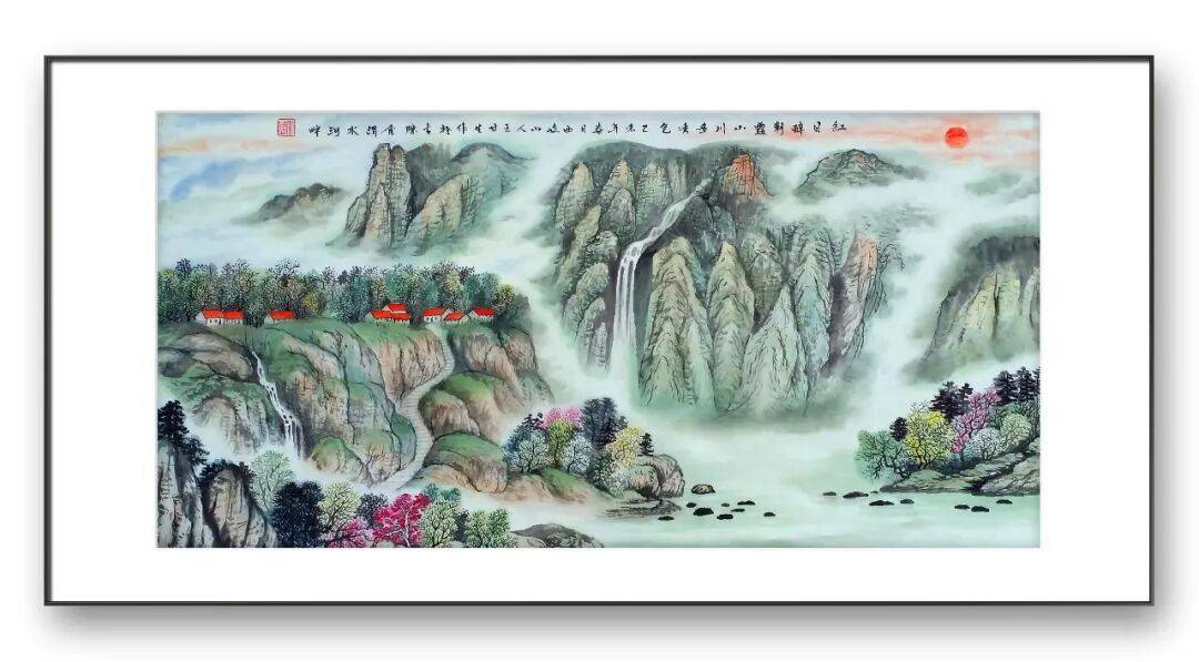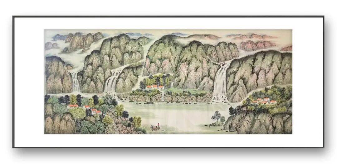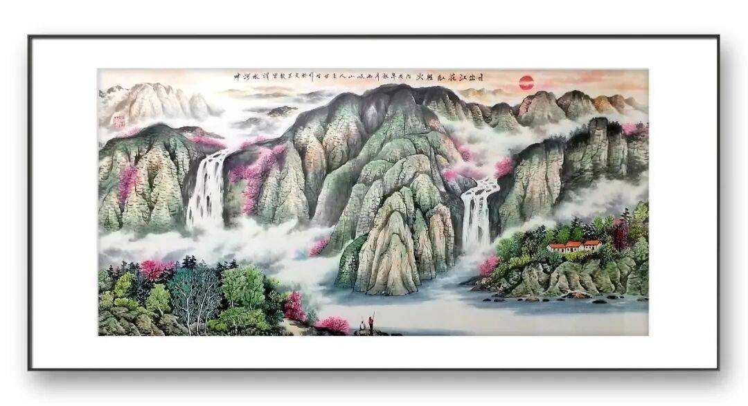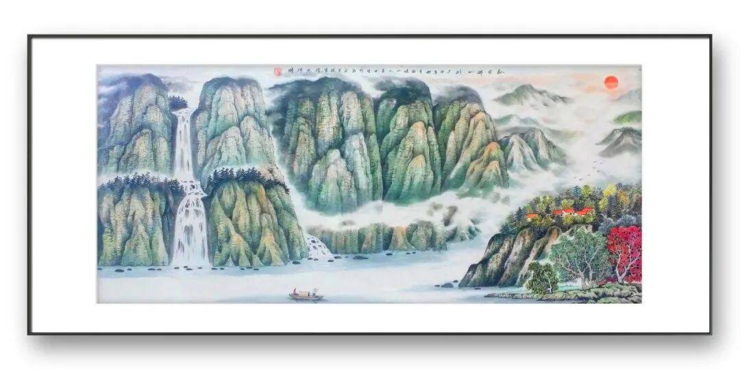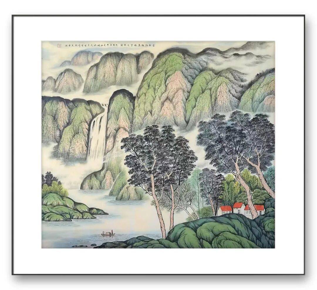 设色上,他突破传统水墨的淡雅调性,以青绿、赭石、花青等矿物颜料营造出鲜明而和谐的色彩层次。山崖间的桃花以粉红点染,与青绿的山石、碧蓝的江水相映成趣,既保留了传统青绿山水的明艳,又融入了写意笔墨的洒脱,让画面兼具视觉冲击力与诗意韵味。构图上,他擅长以全景式布局展现山河壮阔,同时以局部细节营造生活气息。远处层峦叠嶂、红日高悬,近处树木繁茂、渔舟泛江,红瓦小屋隐于林间,整体气势开阔而细节生动,让观者既能感受到山河的雄浑,又能体味到田园的悠然。