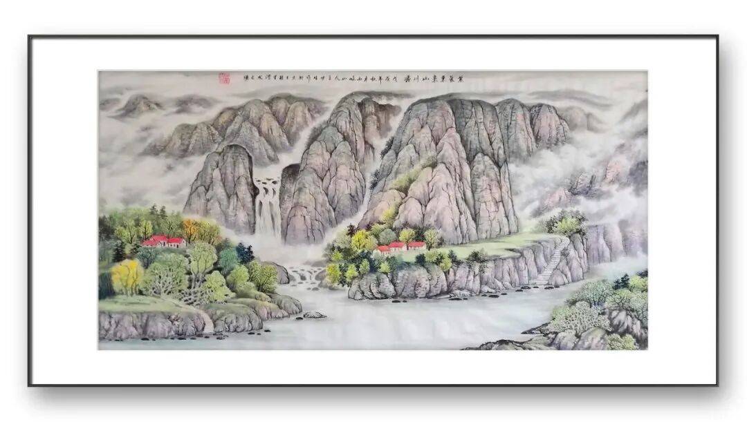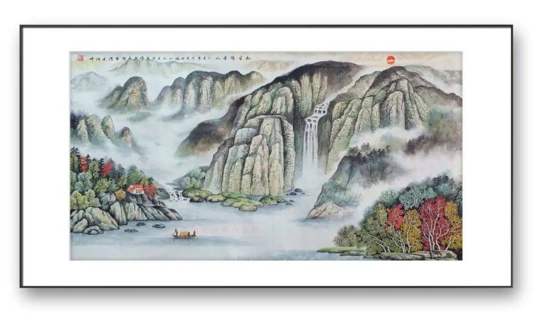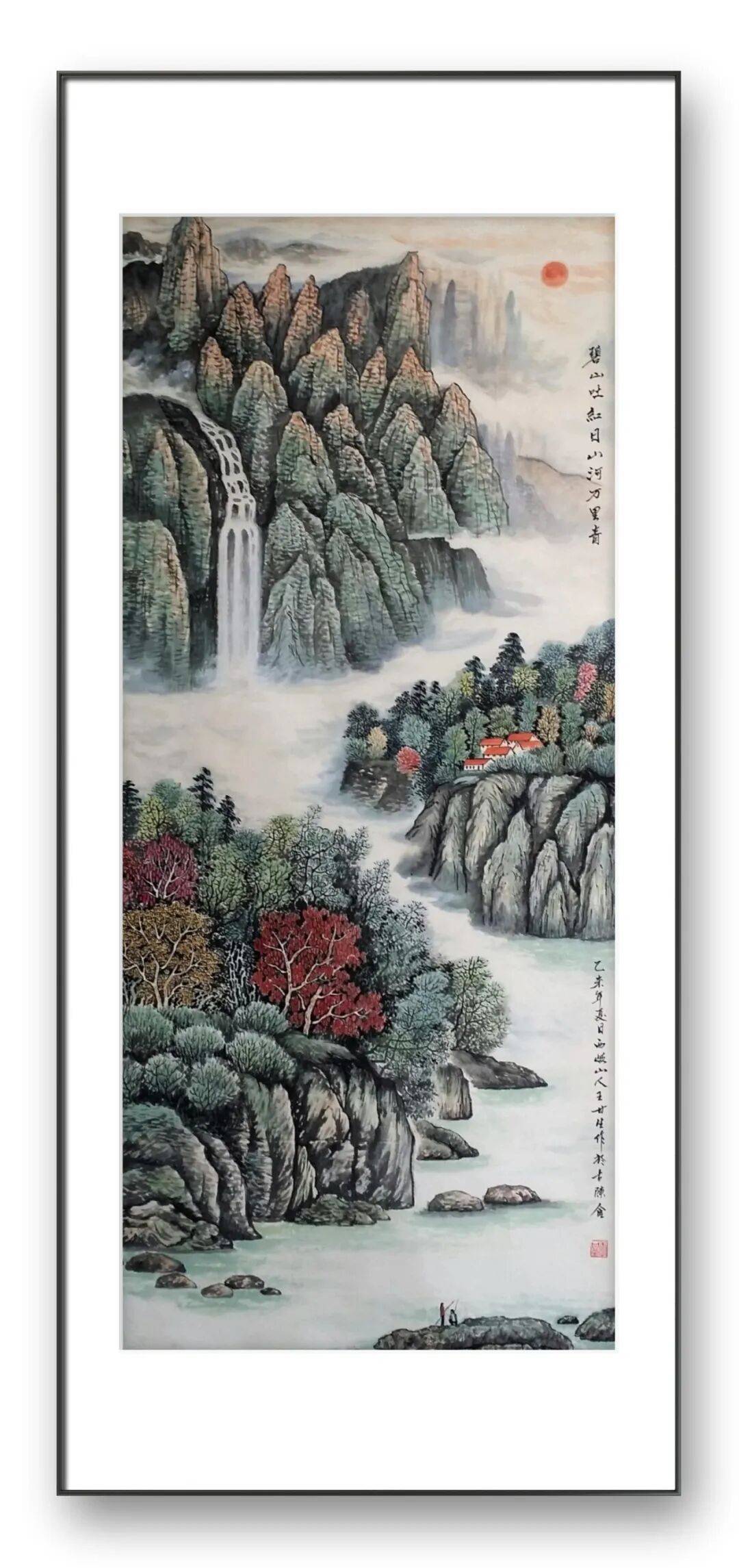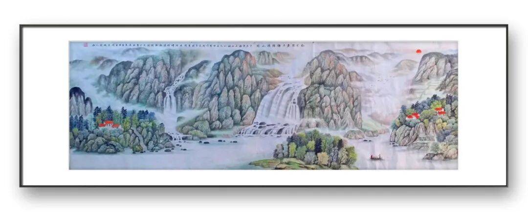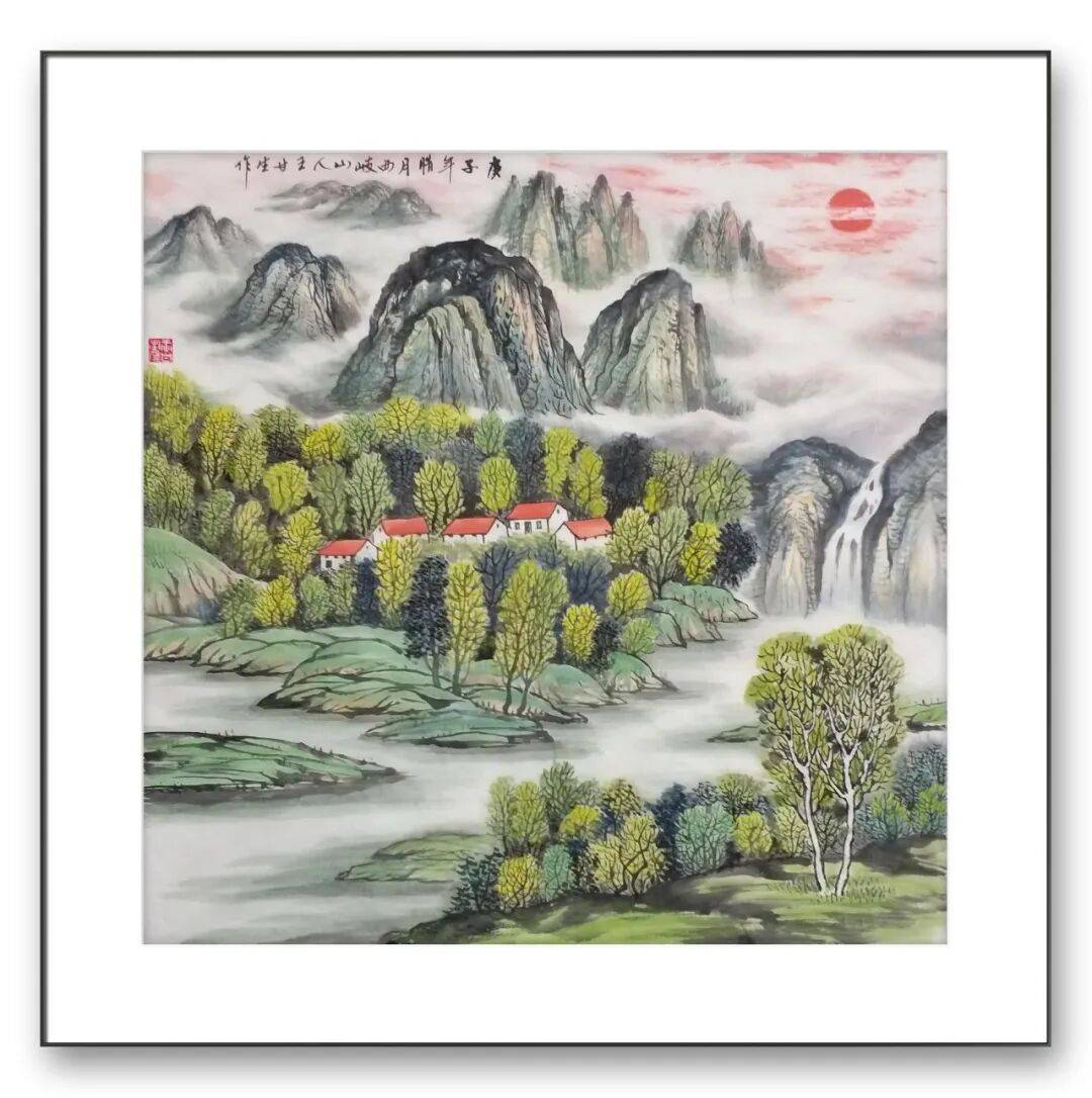 设色上,他突破传统水墨的淡雅调性,以青绿、赭石、花青等矿物颜料营造出鲜明而和谐的色彩层次。山崖间的桃花以粉红点染,与青绿的山石、碧蓝的江水相映成趣,既保留了传统青绿山水的明艳,又融入了写意笔墨的洒脱,让画面兼具视觉冲击力与诗意韵味。构图上,他擅长以全景式布局展现山河壮阔,同时以局部细节营造生活气息。远处层峦叠嶂、红日高悬,近处树木繁茂、渔舟泛江,红瓦小屋隐于林间,整体气势开阔而细节生动,让观者既能感受到山河的雄浑,又能体味到田园的悠然。