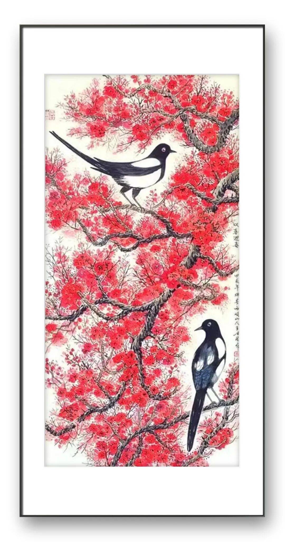 作品将“喜上眉梢”的传统吉祥寓意,与西北大地的炽热生命力相融合,既保留了民俗符号的喜庆意蕴,又以饱满的笔墨传递出春回大地的蓬勃生机。在红与黑的强烈碰撞中,观者既能感受到传统花鸟画的雅致韵味,又能触摸到当代画者对生活的热忱与祝福,是兼具审美价值与文化意涵的佳作。
