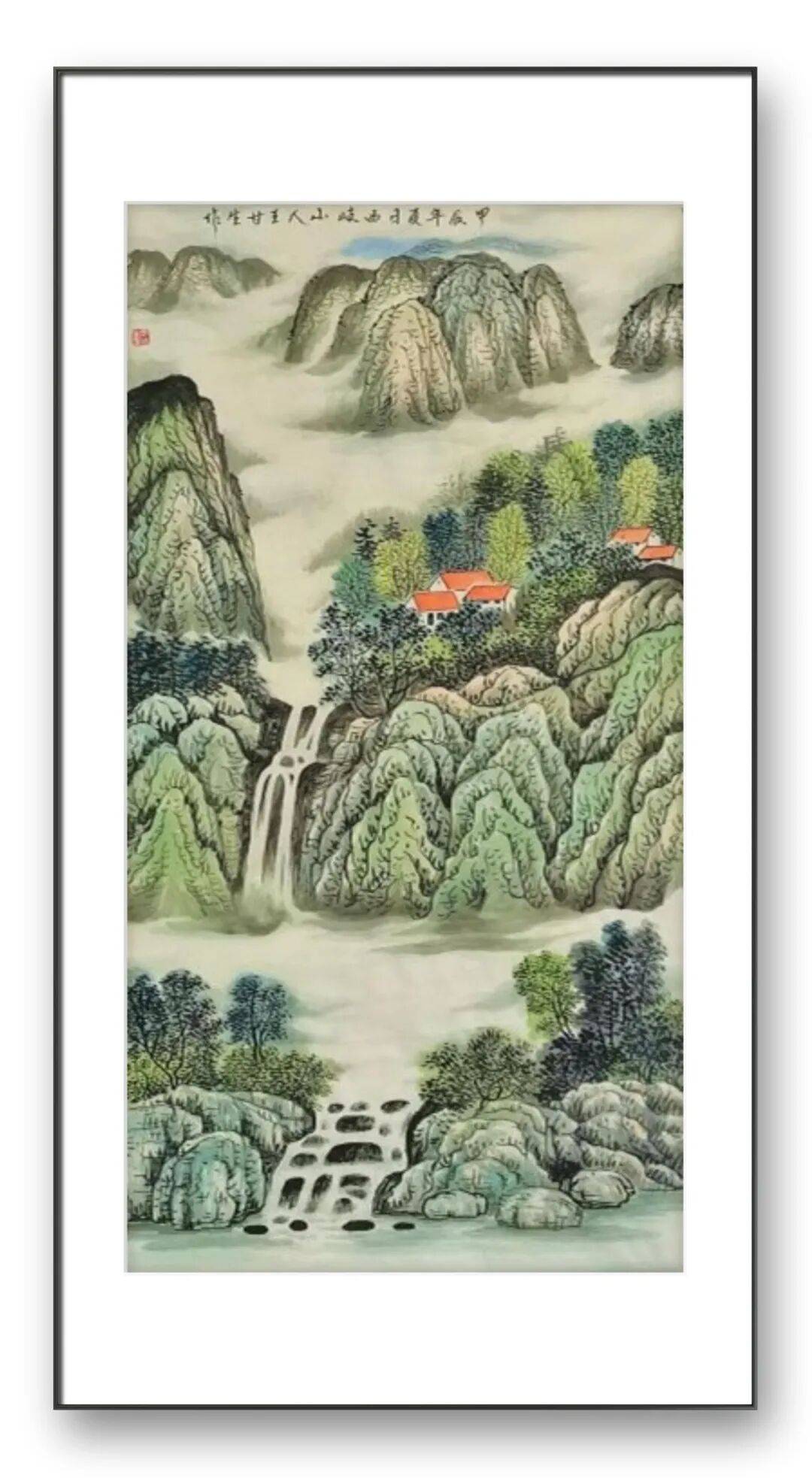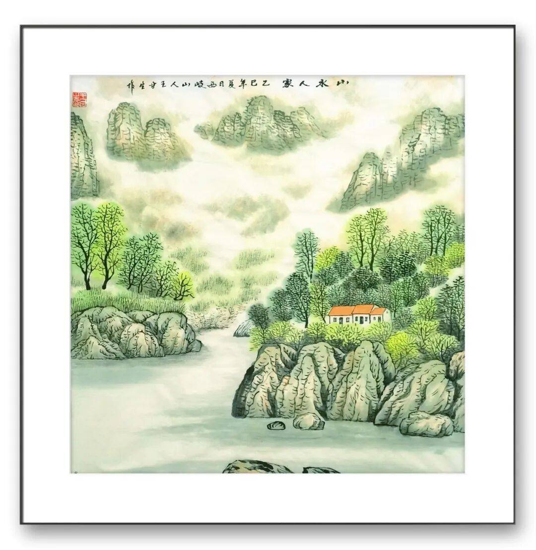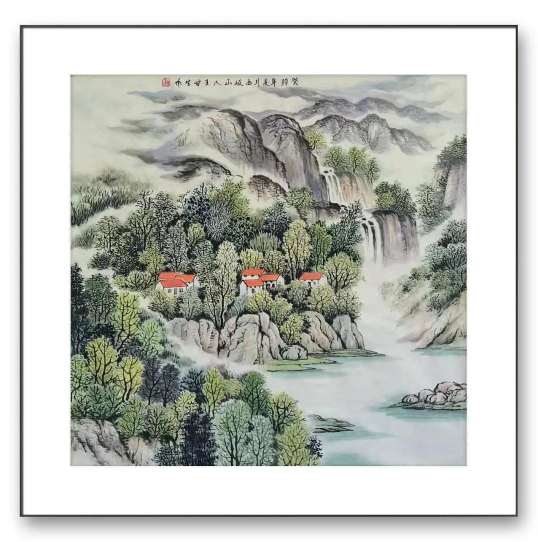 王甘生的作品最动人之处,在于其笔墨间流淌的人文情怀。他笔下的山水并非孤立的自然景观,而是与人的生活紧密相连的精神家园。每一幅作品中,红瓦白墙的小屋、江上的一叶扁舟、窑洞前的行人,都成为连接自然与人文的纽带,让山水有了温度,让画面有了故事。