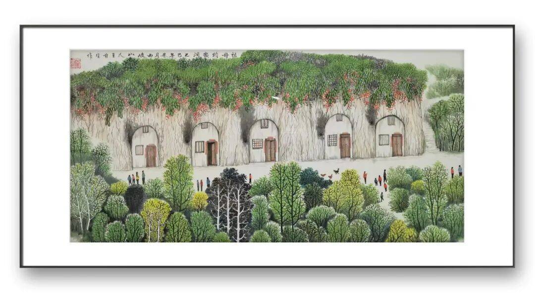 王甘生的艺术根脉,深植于陕西岐山的黄土高原。这片孕育了周秦文明的厚土,不仅赋予他开阔的胸襟,更让他对西北山水的肌理与气质有着天然的共鸣。他的创作并非对自然的刻板复刻,而是将生活感悟与文化记忆融入笔墨,让每一座山、每一道水都带着家的温度。他以细腻的工笔描绘出黄土崖壁上错落的窑洞,崖顶的植被以层层叠叠的点染展现出旺盛生命力,窑洞前的行人与树木构成充满烟火气的生活场景。这幅作品跳出了传统山水画“搜尽奇峰打草稿”的范式,将故乡的寻常风物升华为承载情感的艺术符号,让观者在笔墨间读懂西北人对土地的眷恋。
