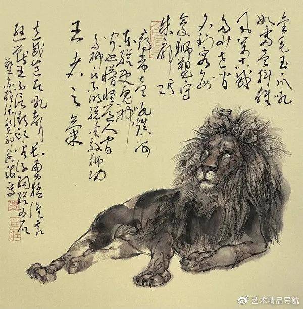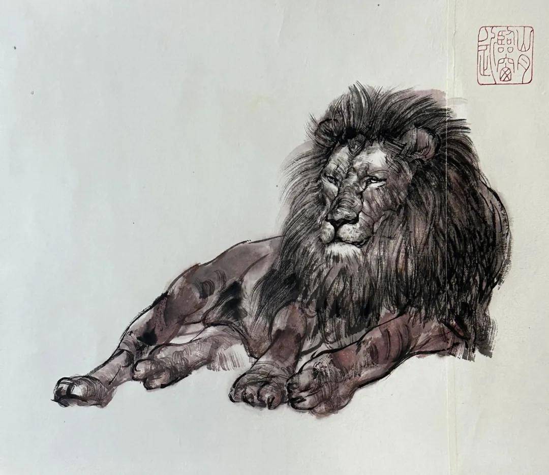 先生之雄狮图,立意笔写实之基者,乃其自创之“中国画素描”理论也。昔者悲鸿先生融西画素描于水墨,虽开新风,然有分块分面之痕,与中画笔墨之流动性稍隔。先生洞察其弊,思补其阙,提出“以线为主、明确结构、线面结合、塑造形体”之法则,以中画之线为骨,以西画之结构为肉,舍西方光影之刻板,取其形体之精准,融于水墨之韵,成意笔写实之体。其画雄狮,先以目观其形,以心会其神,度其筋骨之理,察其肌肉之张,辨其鬃毛之势,而后以笔为刀,以墨为石,勾其轮廓,塑其形体,雄狮之头、身、爪、尾,皆结构精准,体势沉雄,无丝毫之乖谬,无纤毫之失真,此写实之妙也。然先生之写实,非自然主义之摹写,乃经心之提炼,意之取舍,雄狮之威,非徒形之猛,乃神之肃;雄狮之壮,非徒体之巨,乃气之盛。笔未到而意已至,墨未浓而神已显,此意笔之韵也。故先生之雄狮,形神兼备,气韵贯通,写实而不泥于形,意笔而不失于质,此乃意笔写实之至境也。