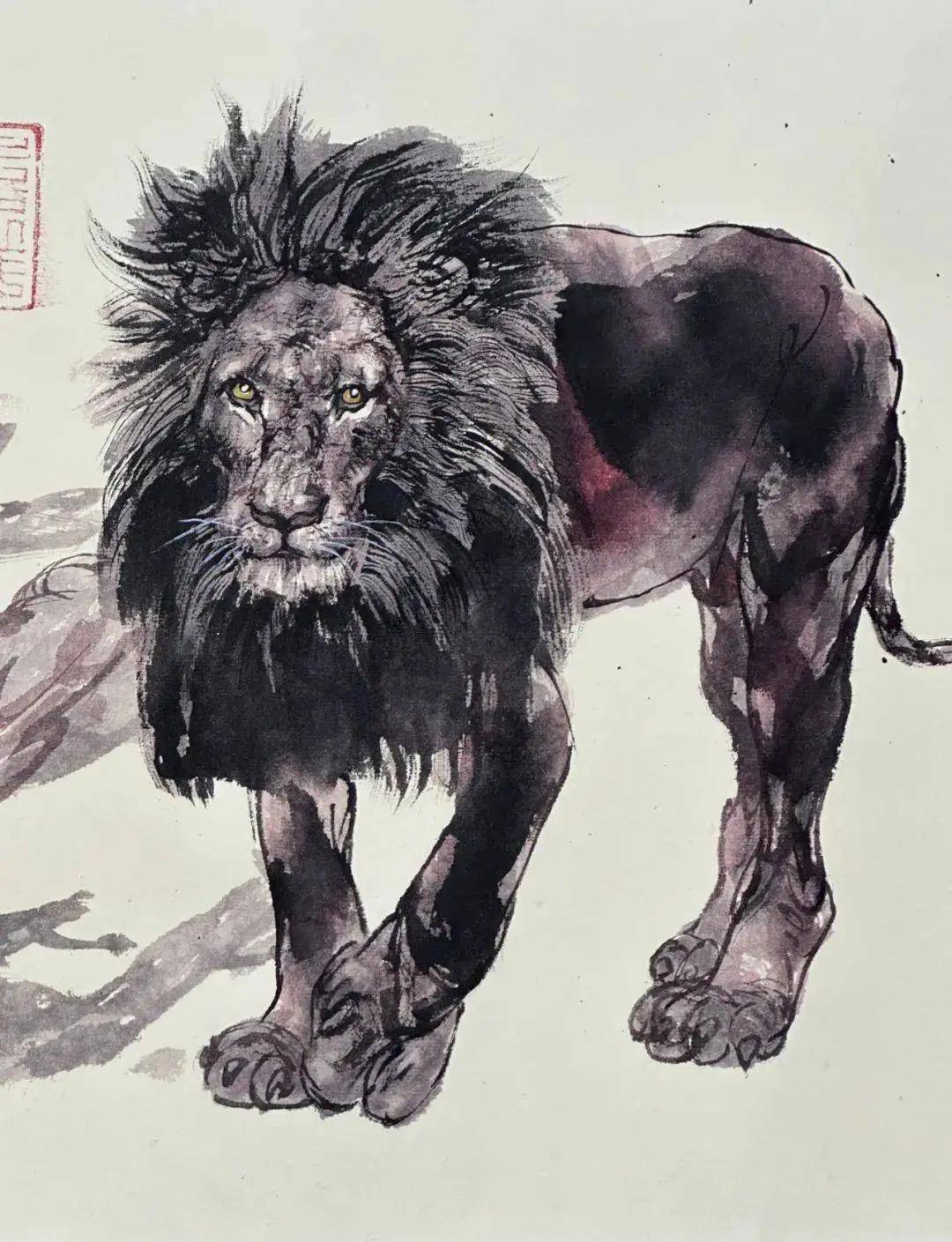 先生复创“汉风皴”之法,以笔代刀,融汉画石刻之质感于水墨之皴擦,其画雄狮之皮毛,以汉风皴施之,用笔果断,如刻刀凿石,方向万端,力度千变,皴擦之间,皮毛之粗糙、之厚实、之立体感毕现,复以积墨、破墨、泼墨诸法辅之,先淡墨铺底,再浓墨皴擦,层层叠加,墨色浓淡干湿焦,五色兼备,十彩纷呈,雄狮之皮毛,或深或浅,或明或暗,有凹凸之形,有虚实之韵,此非徒笔墨之巧,乃书写之性与皴擦之法相融,成笔墨之新境也。先生更用“三冲合一可控渗墨法”,水、墨、色相冲,自然渗化,看似无意,实则有心,雄狮之皮毛纹理,浑然天成,无雕琢之痕,此皆书写之性引之,笔墨之韵生之也。故先生之雄狮图,每一笔皆有书法之韵,每一点皆有书写之神,笔墨因书写而活,雄狮因笔墨而灵,书写性为笔墨之魂,笔墨为书写性之体,二者相融,成先生雄狮图之独特笔墨语言。