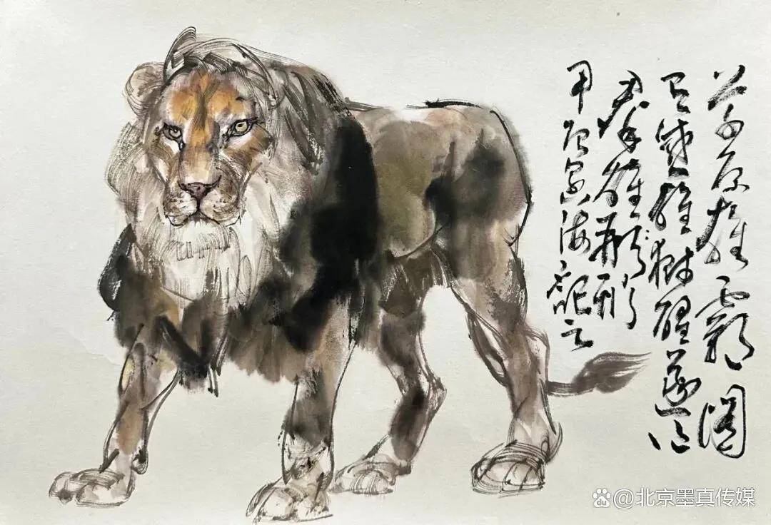 先生之雄狮图,以笔墨之书写性,突显绘画之绘画性,此乃先生画道之精义也。夫绘画之性,在于以形写神,以笔传情,以墨造境,舍此,则画失其本,沦为摹物之器,炫技之具。近代以来,画坛或有重素描而轻笔墨,重形体而轻书写者,其作虽形准而韵失,体实而神枯,绘画之性泯矣;或有重写意而轻结构,重笔墨而轻形体者,其作虽韵足而形疏,神浮而体虚,绘画之性亦失矣。先生深察其弊,以书写性为桥,融笔墨与形体,合意笔与写实,使绘画之性复彰。