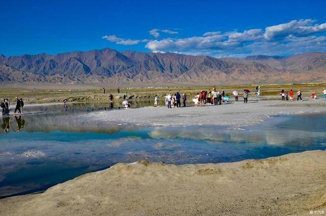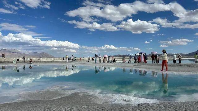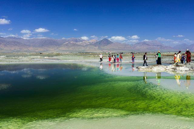 由于盐湖所含矿物质不同,加上太阳光照的时刻变化、降雨量和蒸发的影响,不同时间段前往翡翠湖看到的风景也不一样。风平浪静时,湖面盐花似冰雪;晴空万里时,湖面倒映着蓝天白云和皑皑雪峰,宛如人间仙境。
