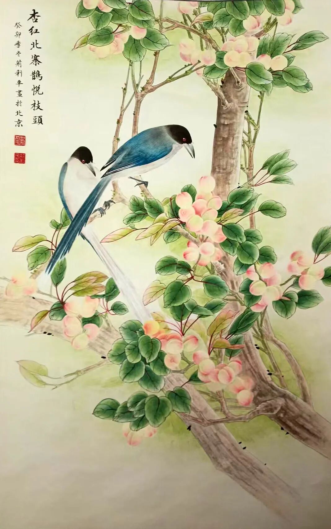 2013年,这幅《秋韵》入选中央文献出版社《文化强国—中国艺术大家与经典作品典藏》,成为他艺术成就的重要见证;2025年,他的《燕山秋色》等作品又入选科学文化出版社《盛世华章》,作品中燕山秋日的层林尽染与花鸟的灵动鲜活,再次展现了他对工笔花鸟艺术的深度驾驭。如今,年过花甲的荆利平仍保持着每日绘画的习惯。在他的画室里,案头堆满了历代工笔名作的摹本与写生稿,调色盘上的颜料虽已斑驳,却依旧能调出最鲜活的色彩。他常说:“工笔花鸟讲究‘慢’,一笔一划都要经得起推敲,就像人生,唯有沉下心来,才能画出真意。”从顺义插队时的青涩创作,到如今成为工笔界的中坚力量,荆利平用数十年的笔墨坚守,不仅绘就了花鸟世界的万千姿态,更诠释了一位艺术家对传统艺术的热爱与传承他的作品,如同春日里绽放的花朵,在时光的沉淀中,愈发散发着动人的艺术魅力。