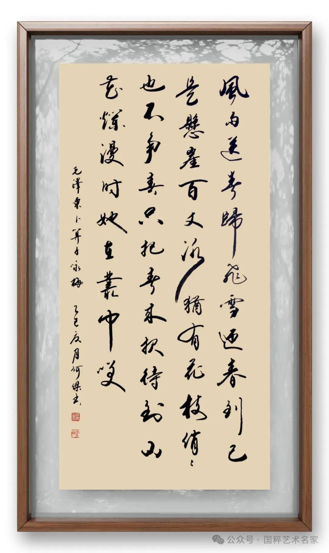 品其章法与墨法,更能感受到他的艺术匠心。在章法布局上,何杰先生突破了行列均质的传统布局,融入现代平面构成理念,追求"密不透风,疏可走马"的对比效果。作品中时而字距压缩形成视觉块面,时而留出留白作为呼吸气口,使得整体布局张弛有度,视线引导自然。在墨法运用上,他更是巧用"墨分五彩"的技巧,将浓、淡、干、湿、枯、润的墨色变化融入创作之中。重墨块面与飞白线条形成强烈对比,浓墨如漆,枯笔如丝,墨色的渐变与节奏变化,如同交响乐的强弱交替,为作品增添了丰富的视觉层次与韵律感。有时大笔一挥,枯墨飞白,写出"大漠孤烟直"的雄浑意境;有时铰笔一转,细笔润墨,展现"新月出天涯"的温婉之美,墨色与笔法的完美融合,让作品更具感官诱惑力与艺术感染力。