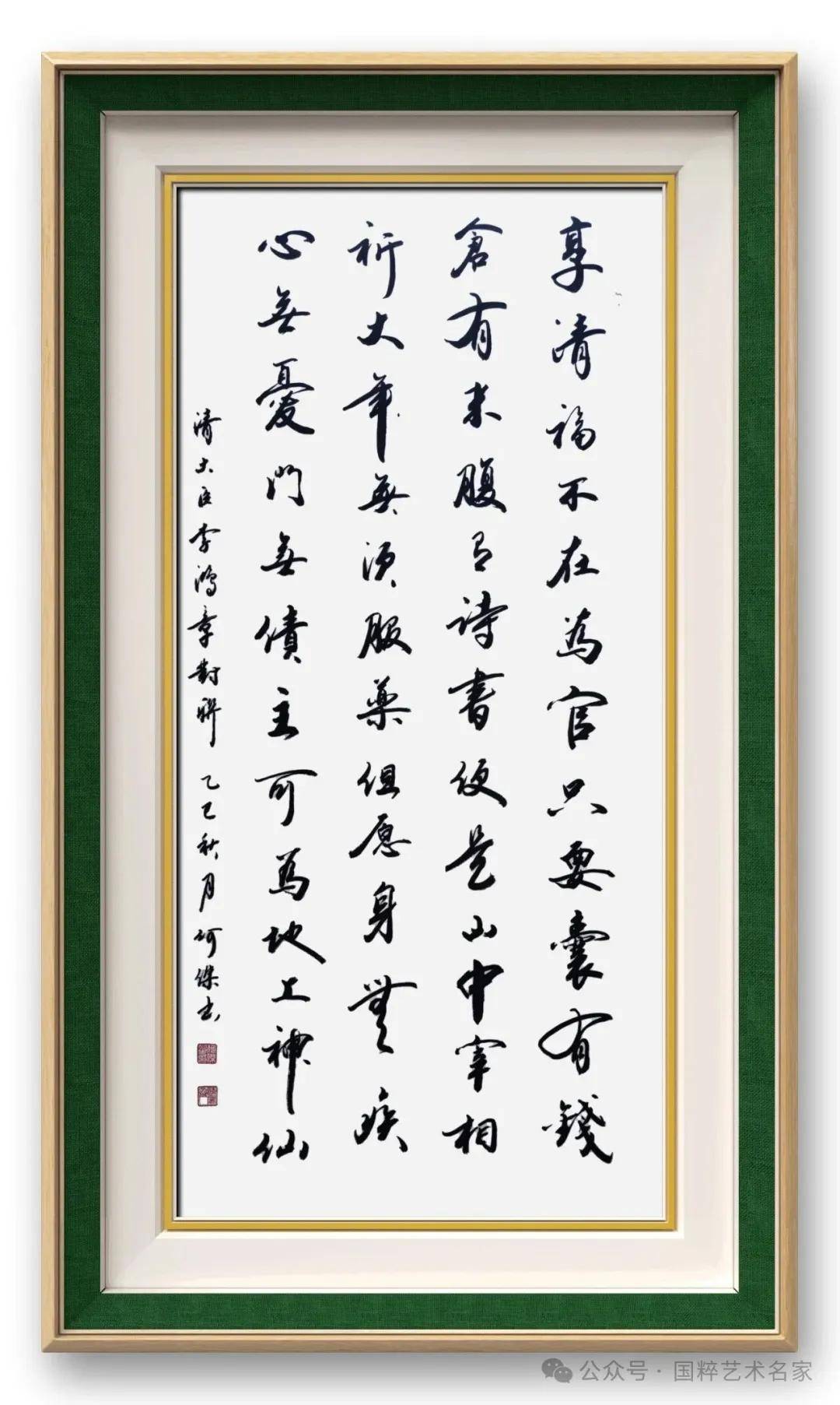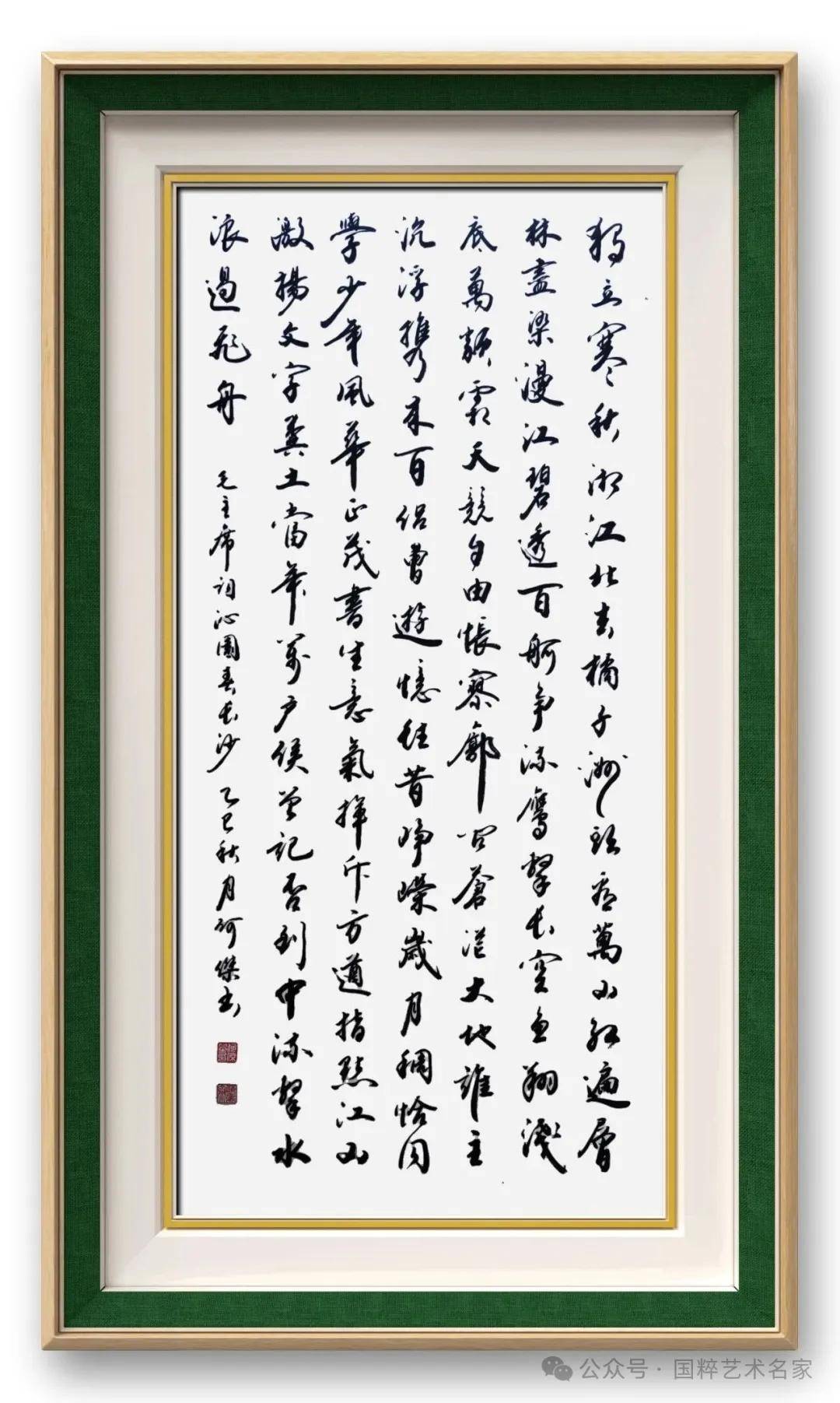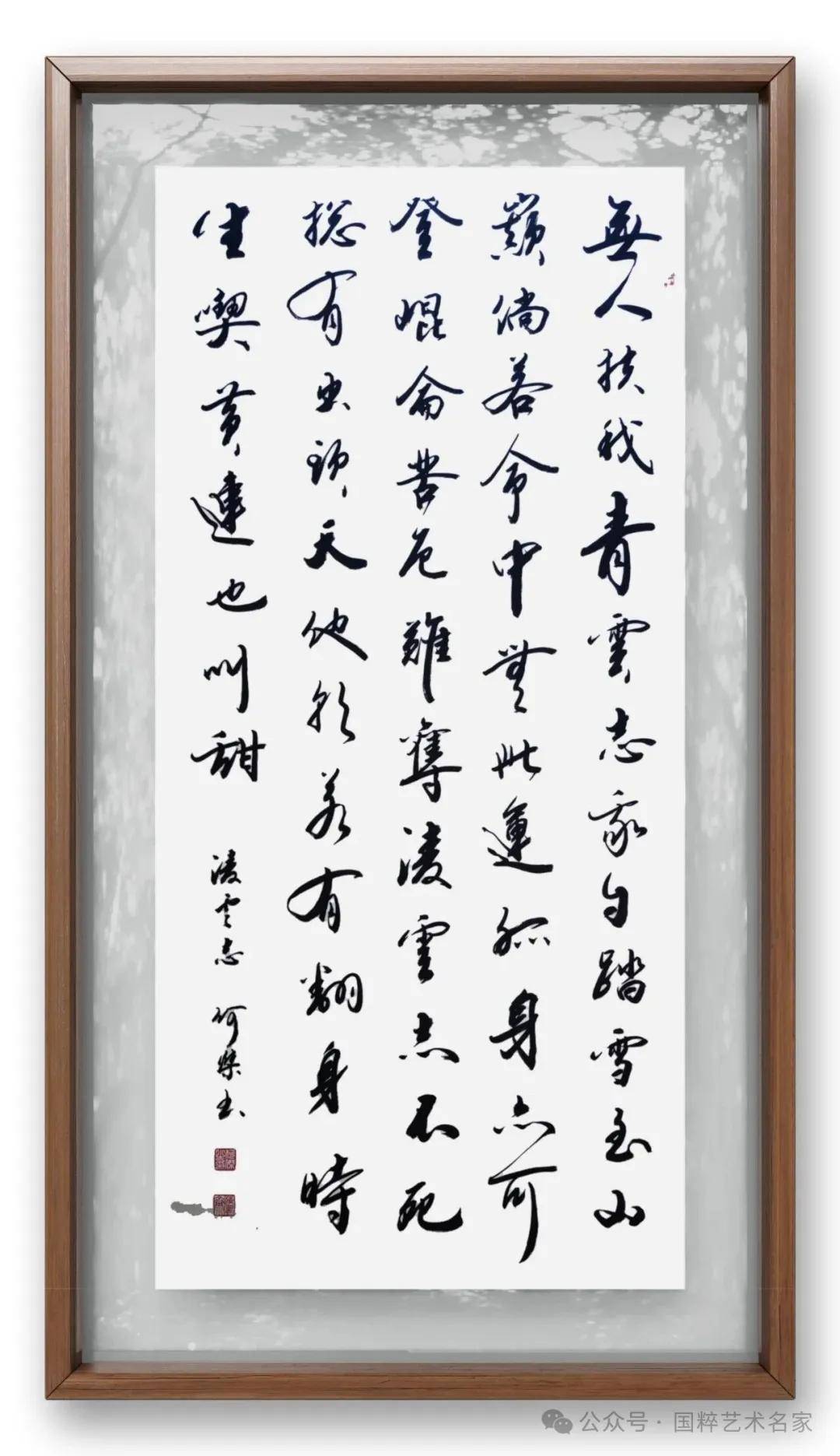 更难能可贵的是,何杰先生将丰富的人生阅历与深厚的文化积淀融入创作,使作品超越了单纯的视觉艺术范畴,成为精神与文化的载体。他的作品中,既有侠之勇的雄浑刚健,又有儒之雅的温婉含蓄,刚柔相济的笔墨背后,是中国传统文化"中庸之道"的深刻体现。同时,他始终以传承民族文化为己任,将对传统文化的热爱与敬畏倾注于每一幅作品之中,其作品不仅展现了书法艺术的独特魅力,更传递了中华优秀传统文化的精神内核。近年来,他的作品多次在重要展览中亮相,荣获2025年将军名家联谊会爱心艺术家金奖等诸多荣誉,这既是对他艺术成就的认可,也是对他文化担当的肯定。