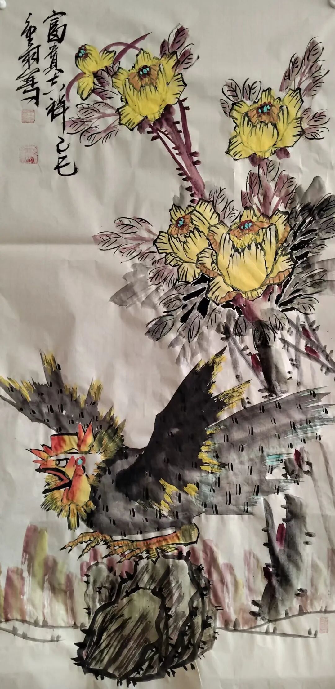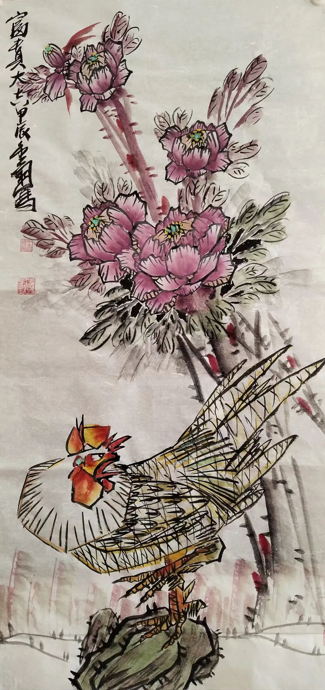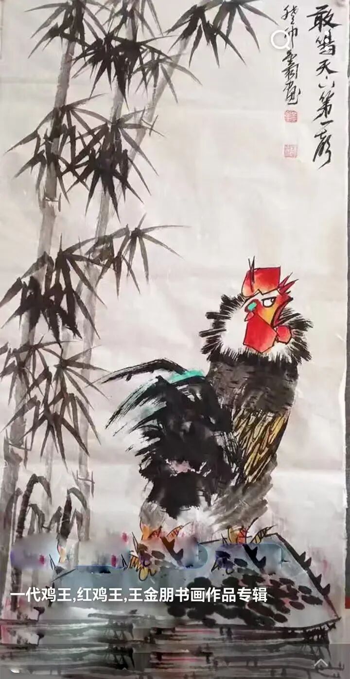 王金朋先生以画鸡闻名,人称红鸡王。王金朋先生自幼研究书画,研究书画他用了三个一千,即,一千刀纸,一千斤墨,一千支笔。