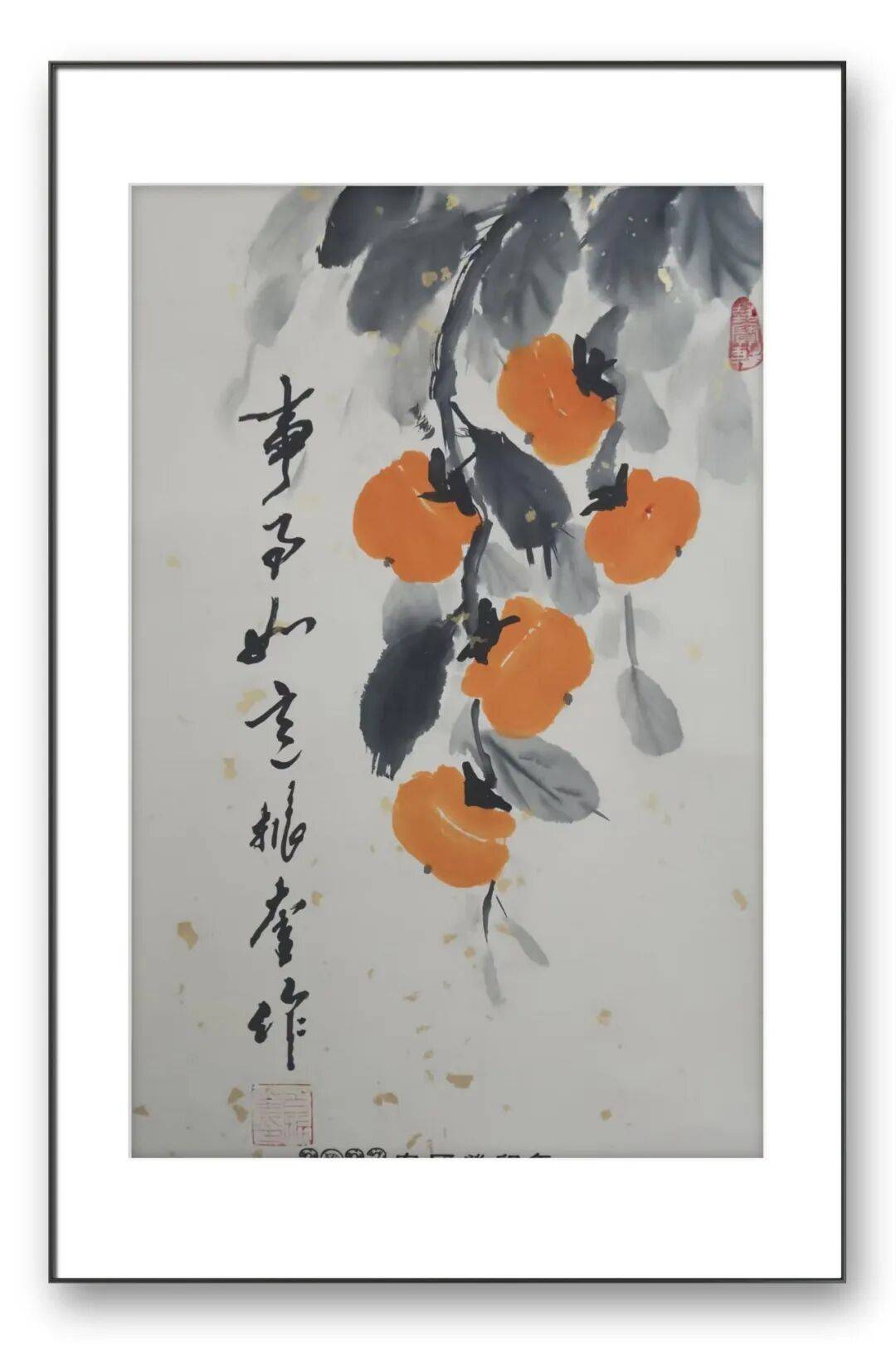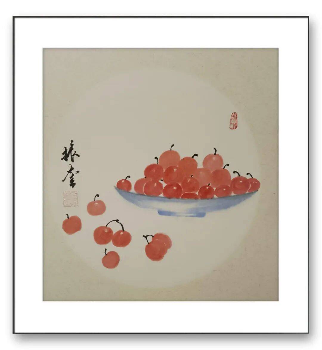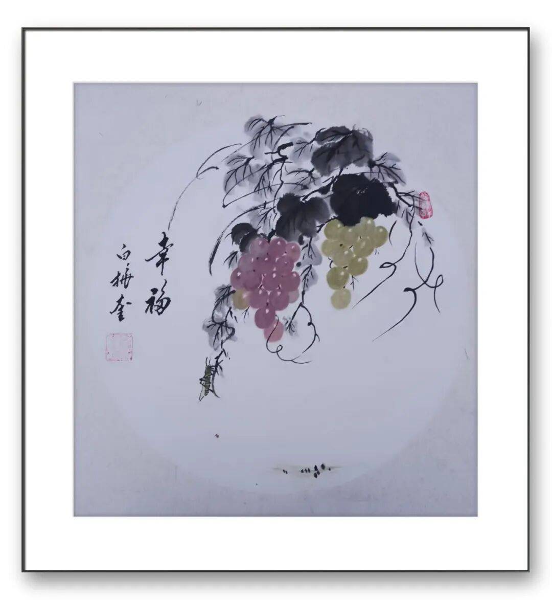 先生的葡萄图,堪称国画创作的经典之作。他以水墨晕染出葡萄藤的苍劲灵动,藤蔓缠绕、舒展自如,线条细腻流畅,疏密有致,尽显藤蔓的坚韧与生机;叶片的绘制更是独具匠心,浓淡干湿层次分明,墨色的过渡自然柔和,似在微风中摇曳生姿,既有水墨的清雅韵味,又有自然的鲜活气息。除了葡萄图,先生的樱桃图与葫芦图,同样独具特色、韵味悠长。樱桃图走清新雅致之风,一篮红樱桃色泽温润,晕染得宜,先生以细腻的笔触勾勒出樱桃的轮廓,又以淡淡的红晕晕染出果实的鲜嫩多汁,仿佛能闻到樱桃的清甜之气;散落于旁的几颗樱桃,疏密有致、错落排布,衬出樱桃的明艳动人,整幅作品笔墨简约却意韵十足,将樱桃的清甜与灵动展现得淋漓尽致,透着浓浓的生活情趣。葫芦图则尽显豪放洒脱之风,墨叶如泼,恣肆豪放,线条刚劲有力,墨色浓淡相生,尽显叶片的苍劲与生机;葫芦的绘制色彩鲜亮、形神兼备,橙黄的葫芦在墨叶的映衬下,格外醒目,仿佛悬挂在藤蔓之上,饱满圆润、寓意吉祥,一只蜻蜓翩然飞至葫芦顶端,为画面增添了灵动生气,让整幅作品动静结合、相映成趣,既透着水墨艺术的豪迈气势,又传递出福禄安康、吉祥如意的美好祝愿。