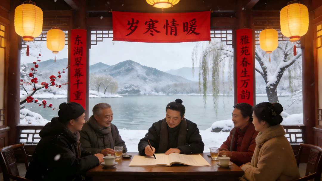 时逢大雪,岁寒情暖,东湖翠幕千重。雅苑春生,文星聚玉盏香浓。幸有青瞳点染,更添得、五色云彤。凝眸处,青山列座,碧水漾柳风。