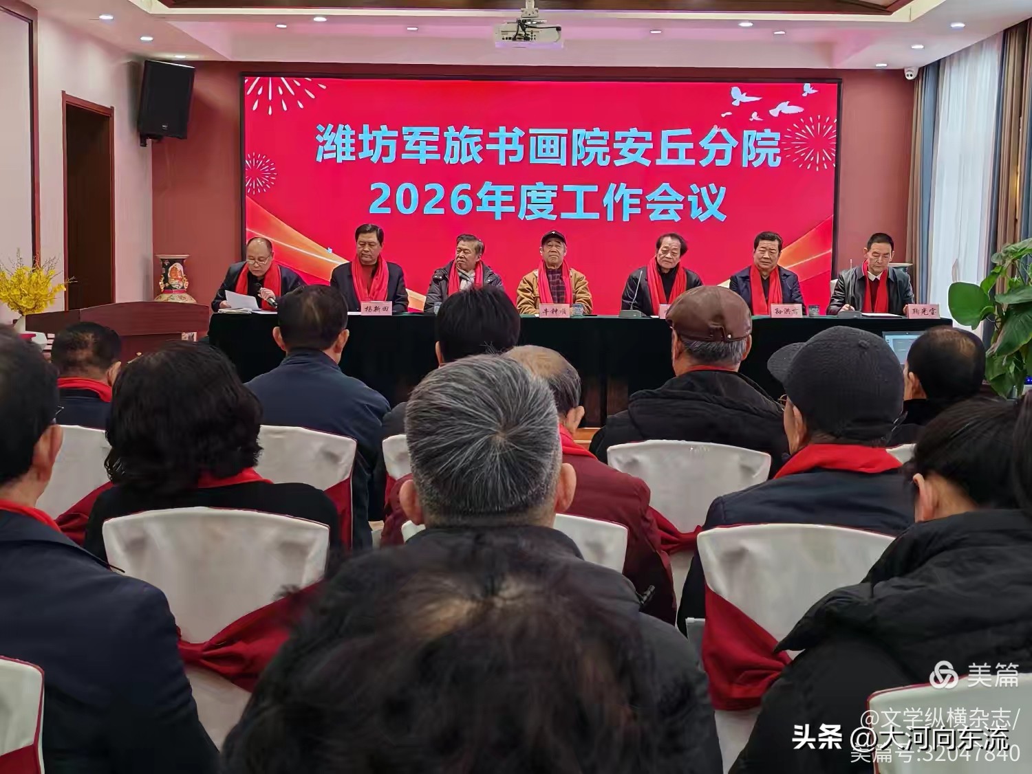 会议由常务副院长李兴国主持,主席台就坐的七位领导包括:中国海洋大学李兰生教授、潍坊学院原党委副书记牛钟顺、潍坊市爱国拥军促进会高级顾问、军旅书画院院长高绪森等知名专家学者。特别值得关注的是,原安丘市政府领导孙洪吉市长的出席,体现了地方政府对军旅文化事业的高度重视。