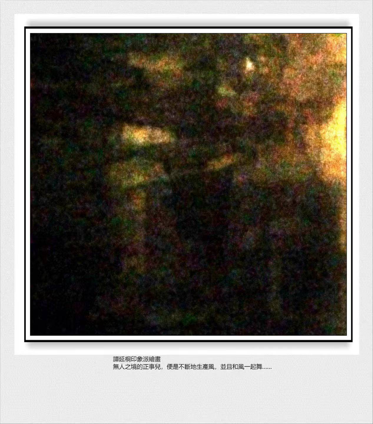 “无人之境的正事儿,便是不断地生產風,並且和風一起舞……”充满了诗意与哲思,为谭延桐的超验绘画赋予了独特的内涵。“无人之境”并非单纯指物理空间上没有人的存在,它象征着一种超越世俗喧嚣、摆脱功利束缚的精神境界。在这个境界里,没有外界的干扰和约束,艺术家能够回归到最本真的自我状态,以纯粹的心灵去感知世界、表达自我。“不断地生產風”中的“风”具有丰富的象征意义。风在自然界中是一种无形却充满力量的存在,它代表着灵动、变化、自由和活力。在艺术创作中,“生产风”意味着艺术家在这个无人之境中,凭借自己的想象力和创造力,不断地激发出灵感的火花,让作品充满灵动与变化的气息。这种“风”是从艺术家内心深处自然流淌出来的艺术生命力。“并且和風一起舞”进一步强调了艺术家与这种灵动力量的融合。艺术家不再是旁观者,而是全身心地投入到创作之中,与自己的灵感、与作品所传达的情感和意境共同舞动。这种舞蹈是一种自由的表达,是对艺术本质的追求和诠释,使作品具有了一种超越现实的诗意和美感。画作题字表达了谭延桐在超验绘画创作中,追求一种自由、灵动、充满生命力的艺术境界,让作品成为心灵与自然、现实与幻想交织的舞台。