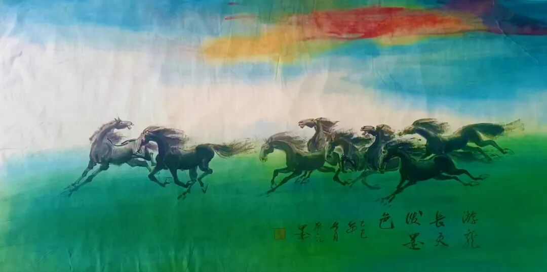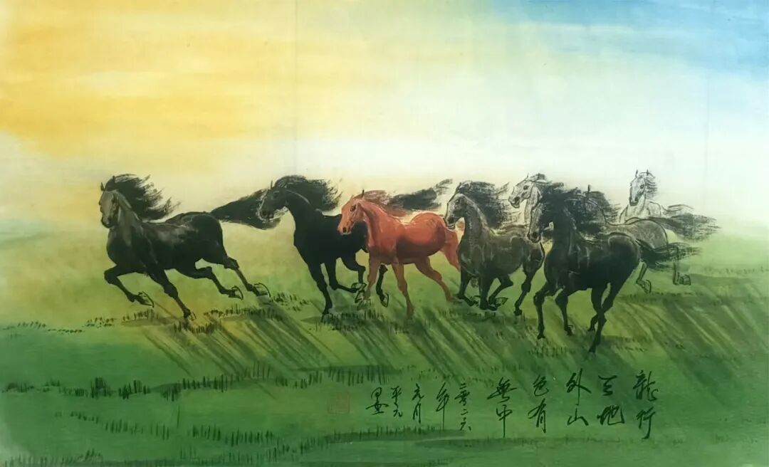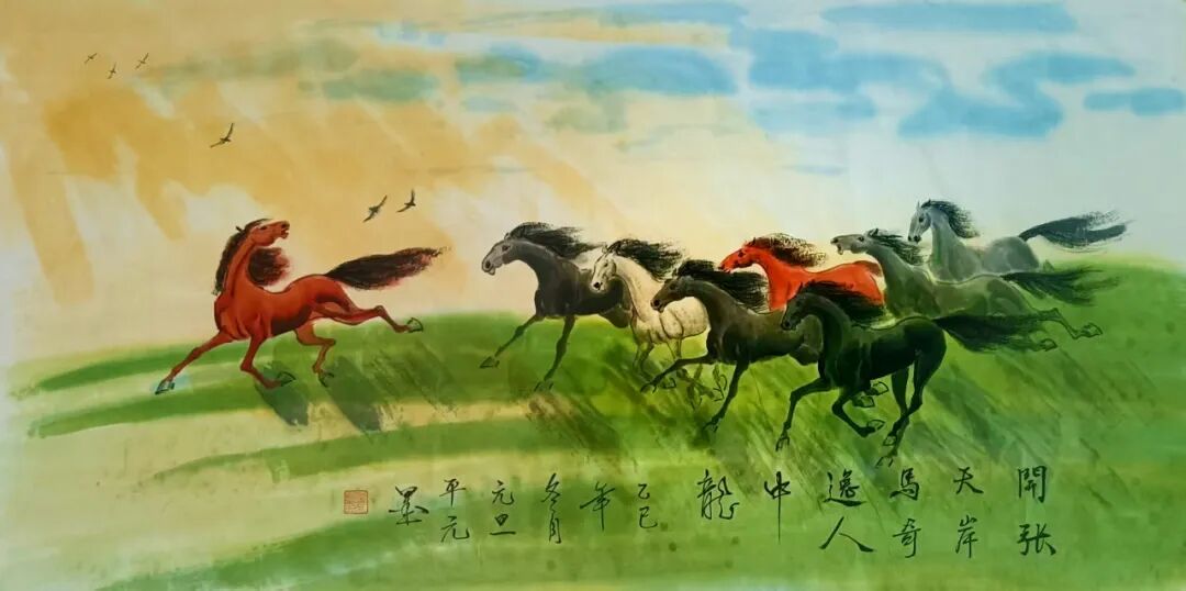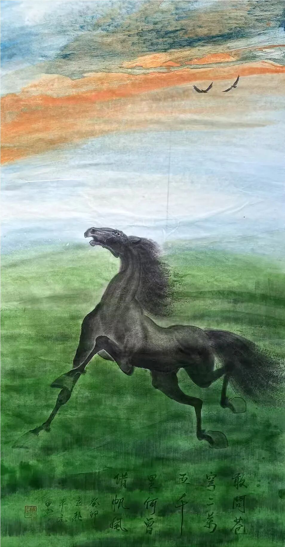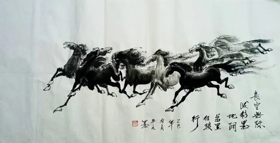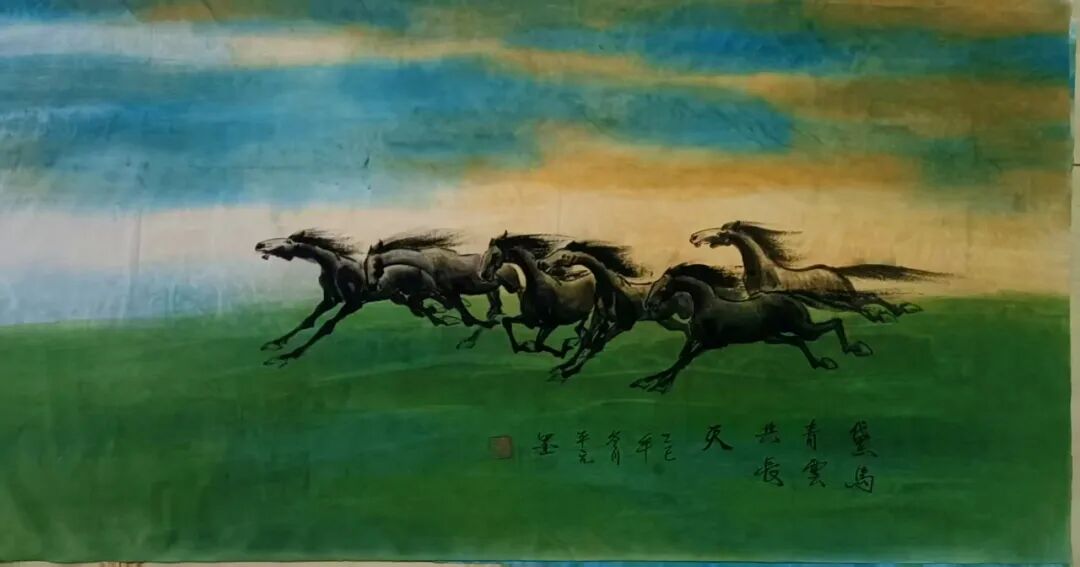 王平元先生的大写意画马,绝非单纯的速度展示,而是对“意”的极致追求。他舍弃了层层渲染的传统方式,以最简约的笔墨捕捉马的精神本质。观其《骏马草原》系列,可见草原的辽阔与马群的奔腾在寥寥数笔间跃然纸上,地平线的横势与马匹的纵势形成张力,墨色的泼洒与留白的巧妙构成空间,画面充满速度感与力量感,却又不失文人画的诗意与空灵。这种大写意的境界,正是徐悲鸿“尽精微,致广大”理念在当代的创造性延伸。