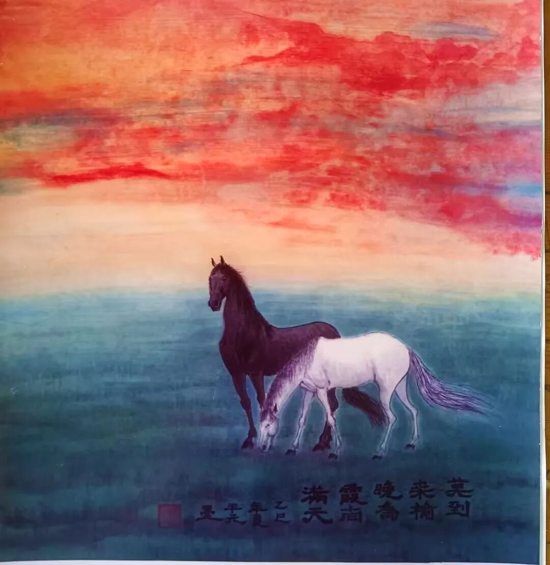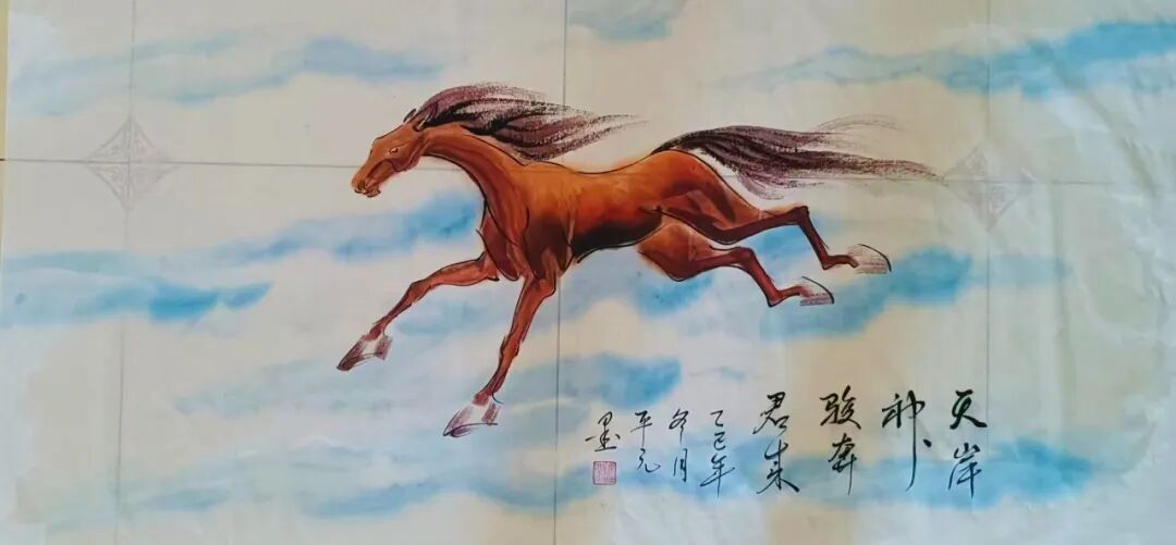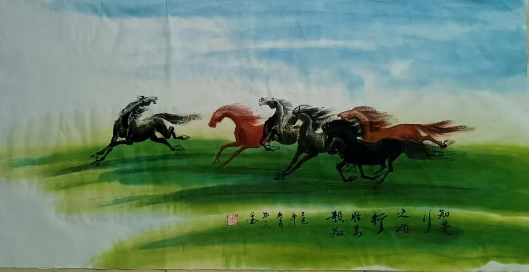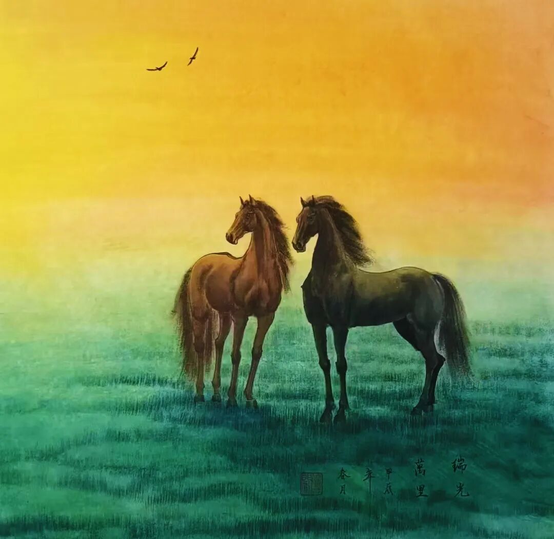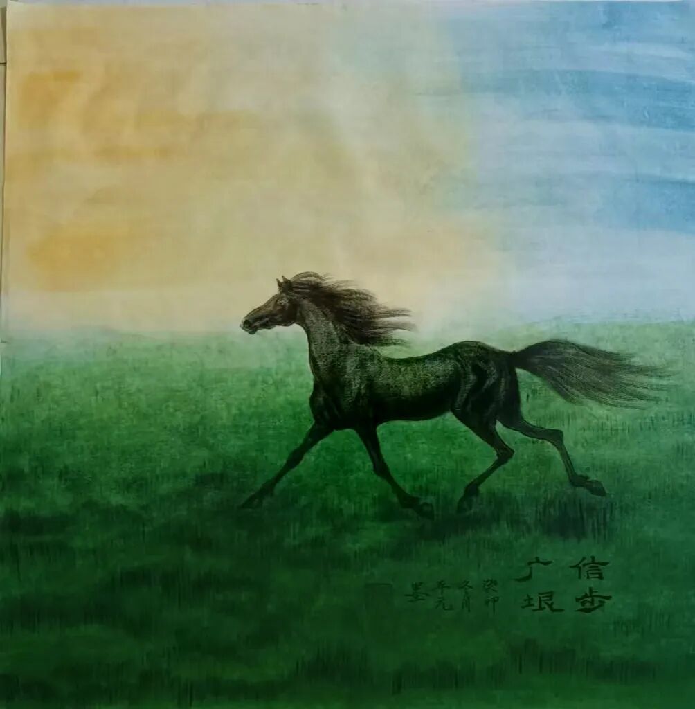 王平元先生的大写意画马,绝非单纯的速度展示,而是对“意”的极致追求。他舍弃了层层渲染的传统方式,以最简约的笔墨捕捉马的精神本质。观其《骏马草原》系列,可见草原的辽阔与马群的奔腾在寥寥数笔间跃然纸上,地平线的横势与马匹的纵势形成张力,墨色的泼洒与留白的巧妙构成空间,画面充满速度感与力量感,却又不失文人画的诗意与空灵。这种大写意的境界,正是徐悲鸿“尽精微,致广大”理念在当代的创造性延伸。