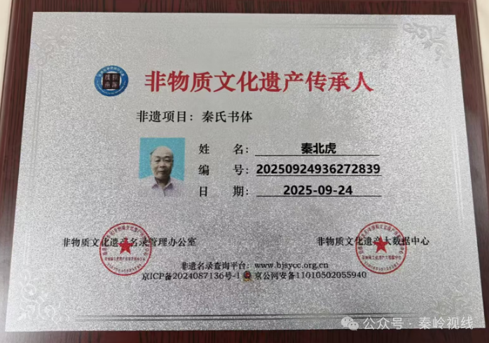 秦北虎,号大秦人,陕西合阳人,是当代著名书法家,在文化界享有盛誉。他有着深厚的书法功底,善左右开弓,笔法刚柔并济,创意独特,自成大家之体。其作品不仅在国内广受赞誉,还成为中国文化走向世界的重要桥梁。2025年9月24日,秦北虎收到编号为20250924936272839的非遗传承人证书,其创立的“秦氏书体”正式列入非物质文化遗产代表性项目名录。