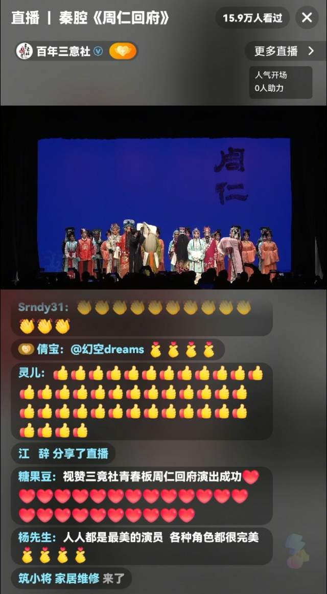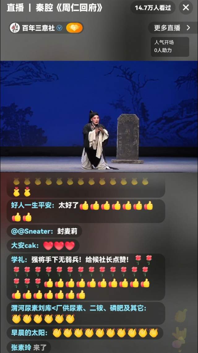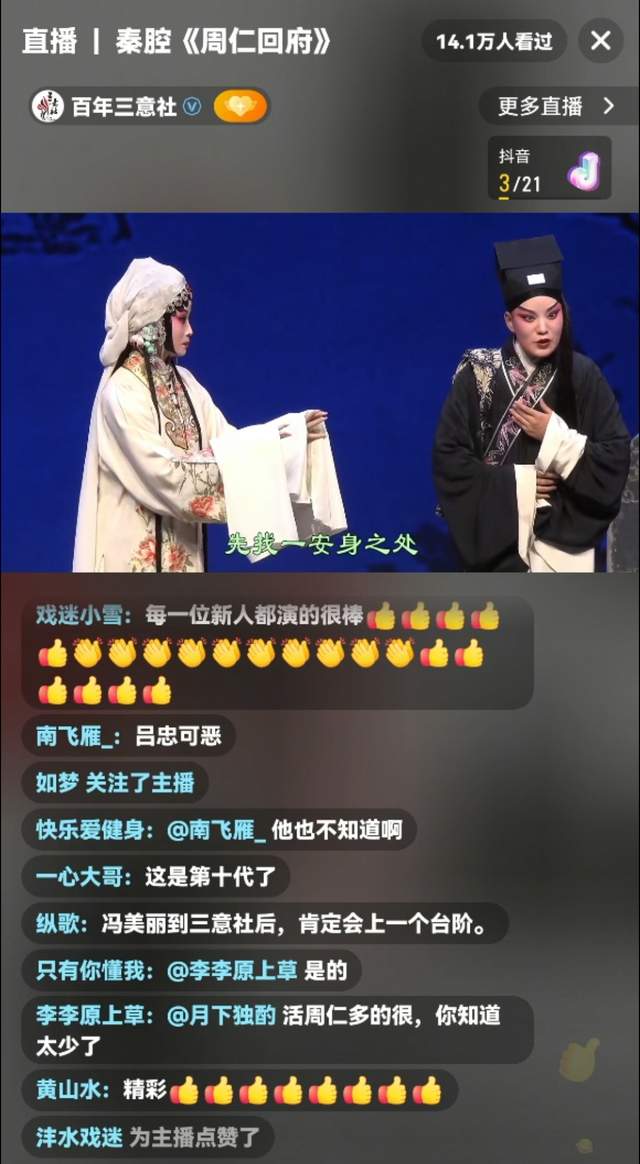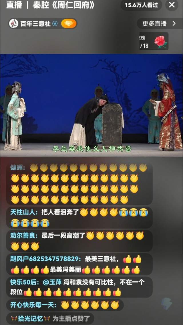 三意社昨晚演出的《周仁回府》,在线上和线下都产生了非常大的影响和好评。在演出现场,观众爆满,好多戏迷都为没有抢到票遗憾着,只能选择在线上观看直播了。在线上,三意社官方直播观看人数一直在增长着,评论区一些戏迷在打着线上观众的人数,十四万、十五万,不停地在增长着,而有人在评论区打字说,在快手平台,观众在线人数则更多,据说有二十八万之多,至于准确与否也不需要解释。不得不说,在评论区,戏迷对冯美丽的好评如潮,点赞、支持不断,也有对李兰英扮演者齐家乐,胡秀英扮演者任美娟点赞有佳的,直播间送小心心,打赏的戏迷也很多,关键是屏幕滚动太快了。