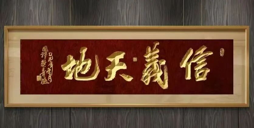 从字形表现来看,樊青山老师的每个字都充满了力量,特别是在“信”和“义”两个字的书写中,笔画刚劲有力,充分表现了信义的坚固与庄严。在“信”字的书写上,笔画的起伏变化极具节奏感,展现出一种内外兼修的气韵,既有强烈的表现力,又不失书法的温润与细腻。特别是“义”字,结构错落有致,笔画之间的搭配自然流畅,突出了义的力量与深远。