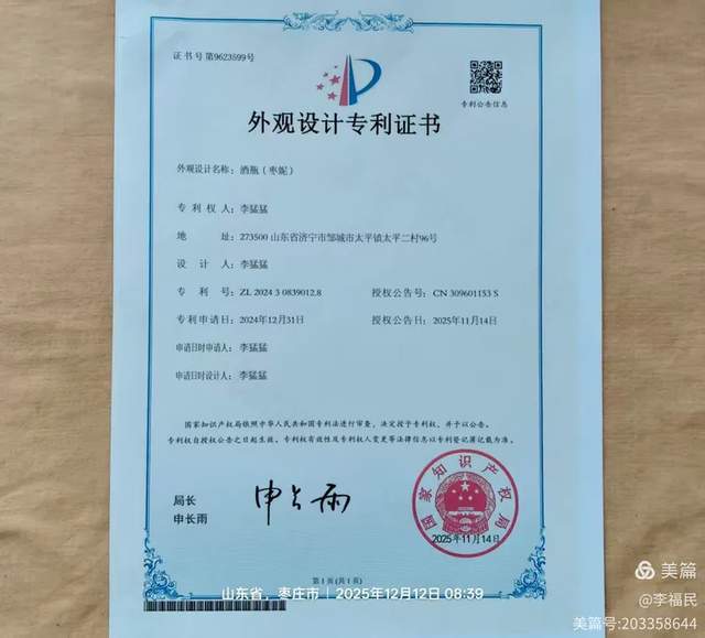 1、央视播出品牌《丝路》枣妮、榴娃系列套酒《专利证书》《授权证书》与样品: