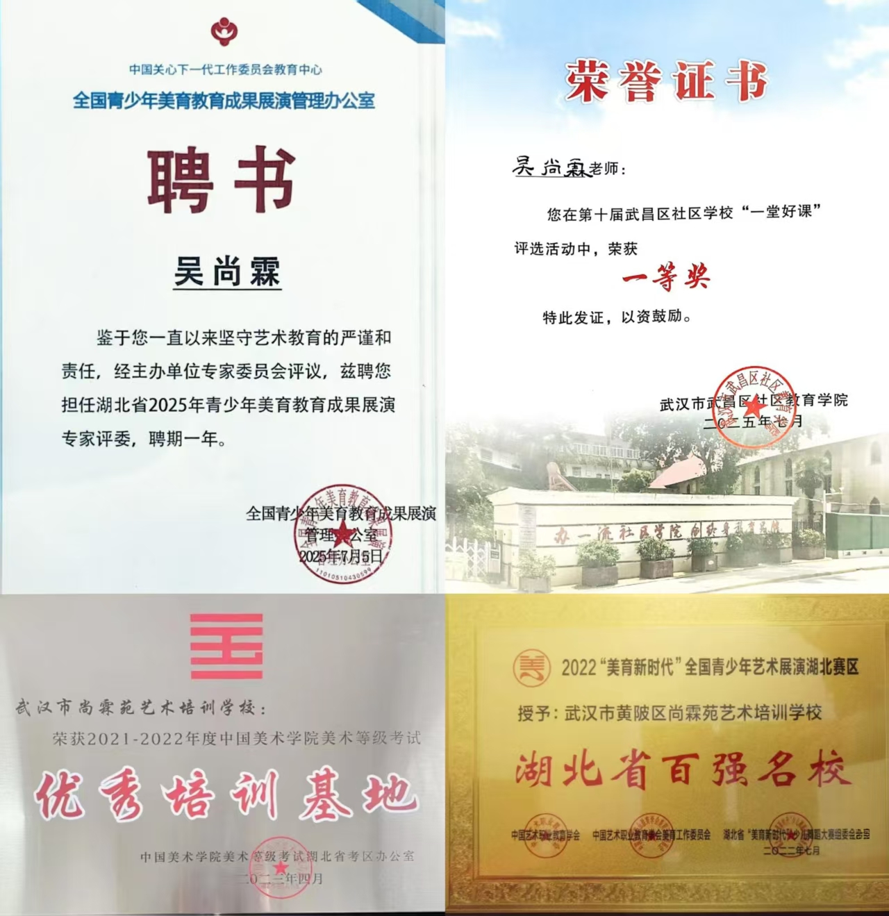 • 2017年10月,创办武汉市黄陂区尚霖苑艺术培训学校;
