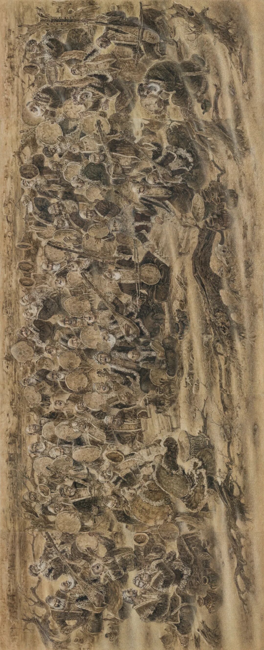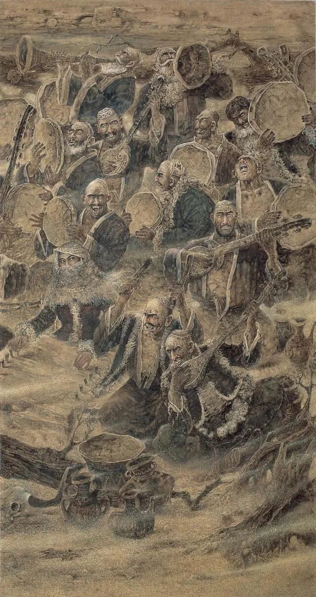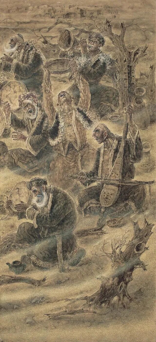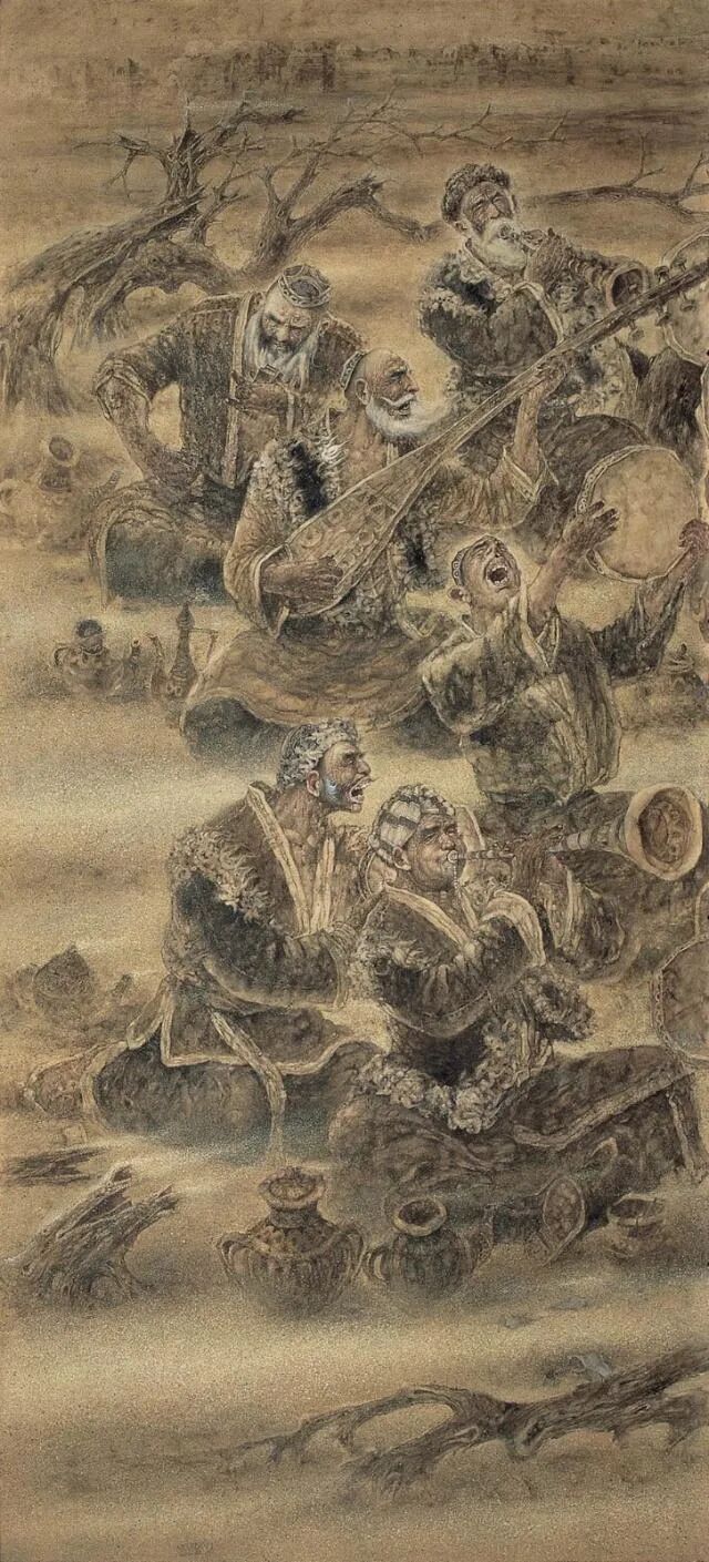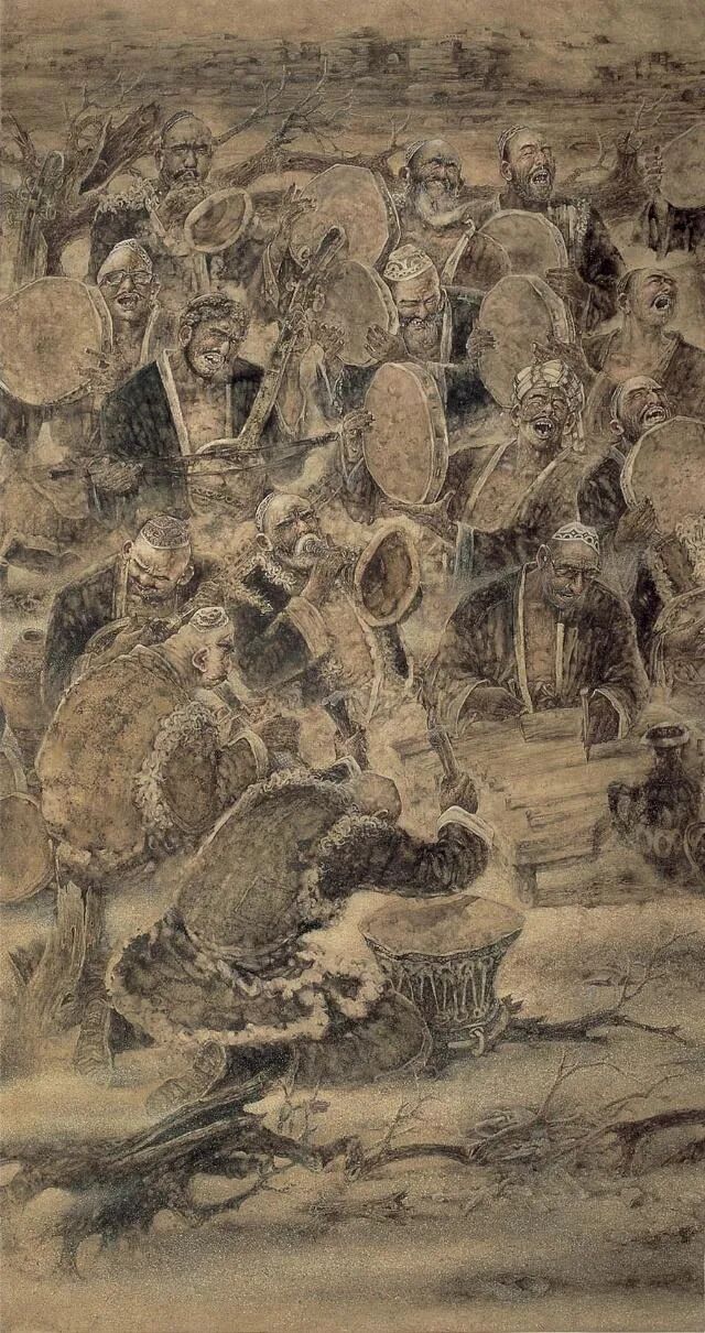 刘选让君的作品《塔克拉玛干之魂》何以动人,因为在他的画中,我们看到他很全面的艺术技巧,坚实的造型能力,纯熟、精湛的笔墨功夫,纯正的绘画品格,趣味、还有顽强的审美追求。前几点一般优秀的画家都拥有,而后一点即顽强的审美追求,则是难能可贵的。这需要有艺术理想,有顽强的毅力,有不屈不挠的探索精神。