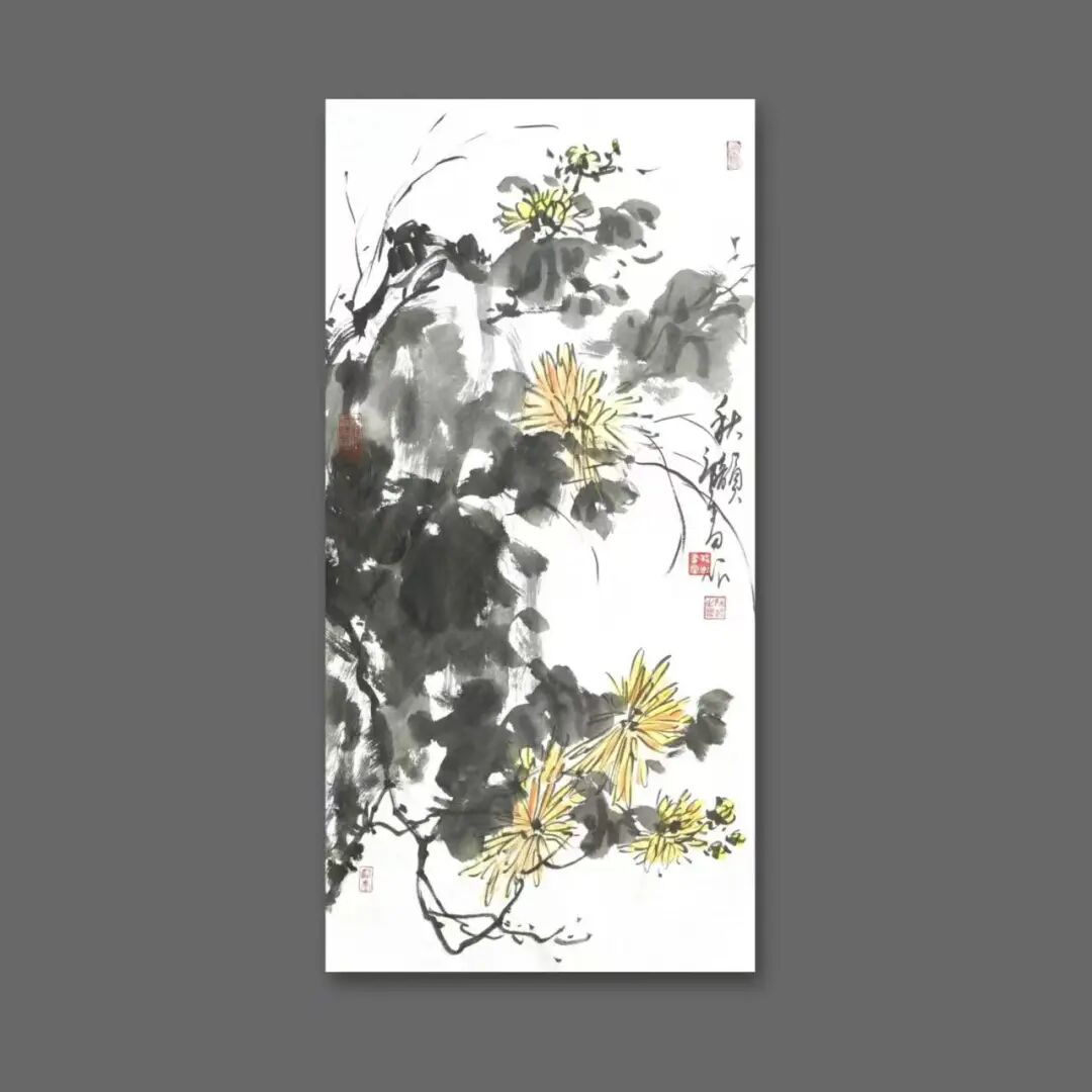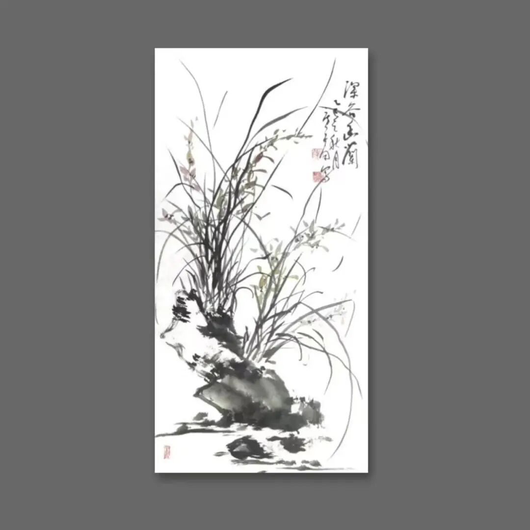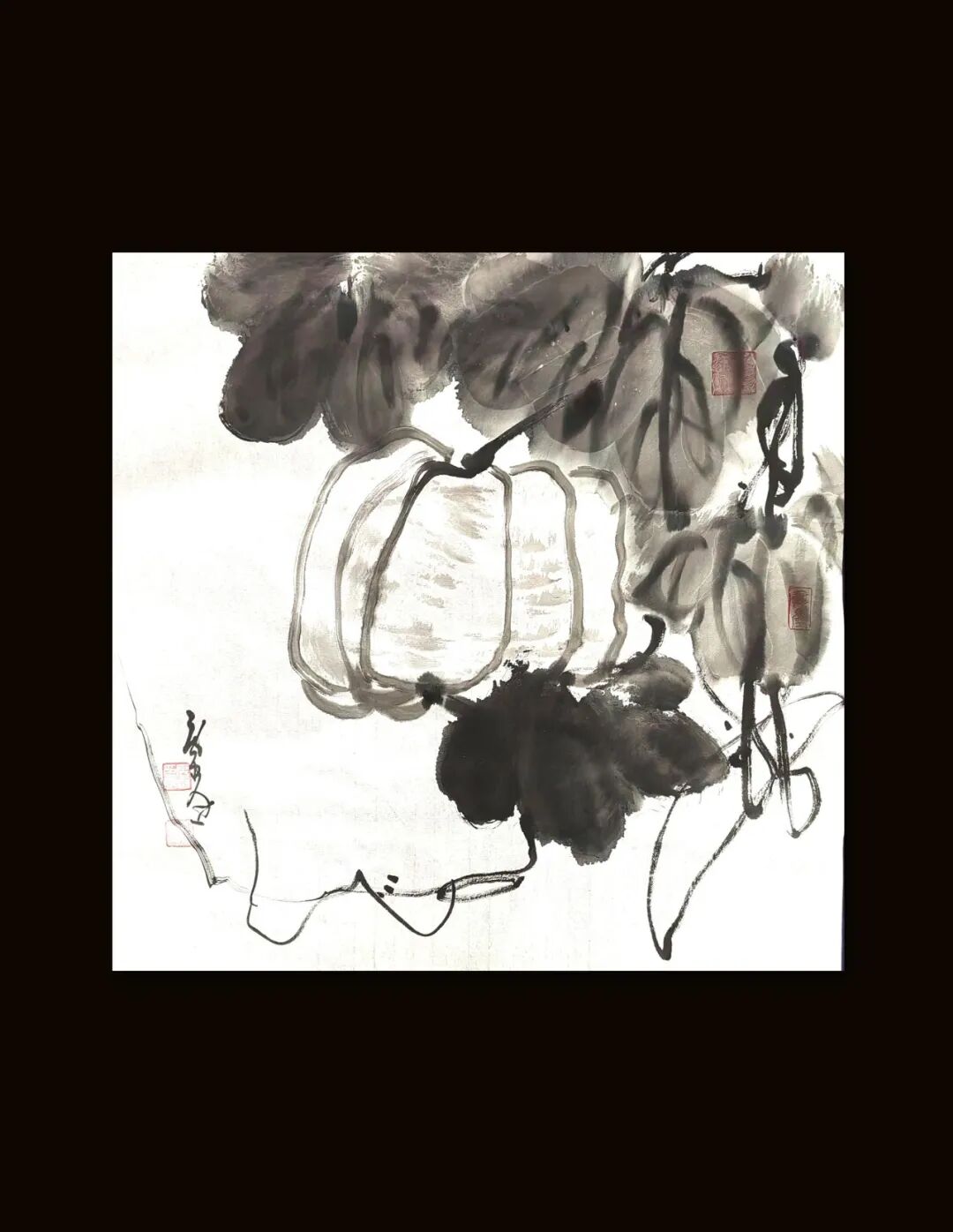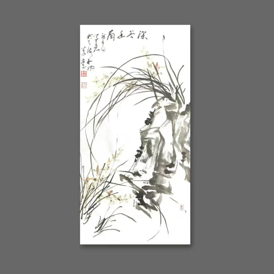 那段曾与父母种菜耕田的乡村岁月,是他艺术生命里的源头活水。晨曦里沾露的菜畦,暮色中归巢的飞鸟,藤蔓上悄然垂落的瓜果,田埂间随风摇曳的野花,这些扎根泥土的生命,以最质朴的姿态,在他心中刻下万物生长的密码。这份对自然的深刻体察,化作他笔下的笔墨语言——《香魂》红梅图里,老干如耕牛拓荒的遒劲,繁花似田埂野花的热烈,墨色浓淡间,是生命挣脱寒冬的倔强;《南瓜图》中,淡墨勾就的瓜形憨态可掬,浓墨点染的藤蔓舒展自在,一笔一画,皆带着蔬果从抽芽到成熟的鲜活气息;《兰石图》里,兰草柔韧如田埂细柳,湖石奇崛似乡间顽石,枯笔写意间,藏着“幽兰生于深谷,不以无人而不芳”的清逸。他笔下的“四君子”,从不是文人画的刻板摹写,而是带着泥土温度的生命礼赞;他绘的山水孤舟,亦不是遥不可及的桃源幻境,而是耕罢归来,坐看云起的田园闲情。