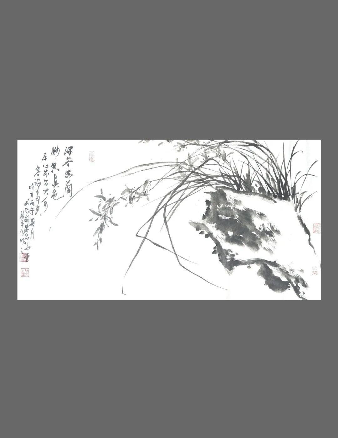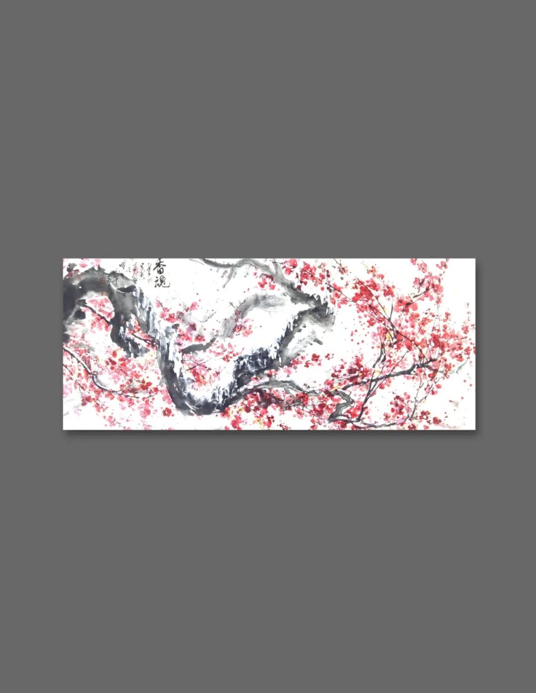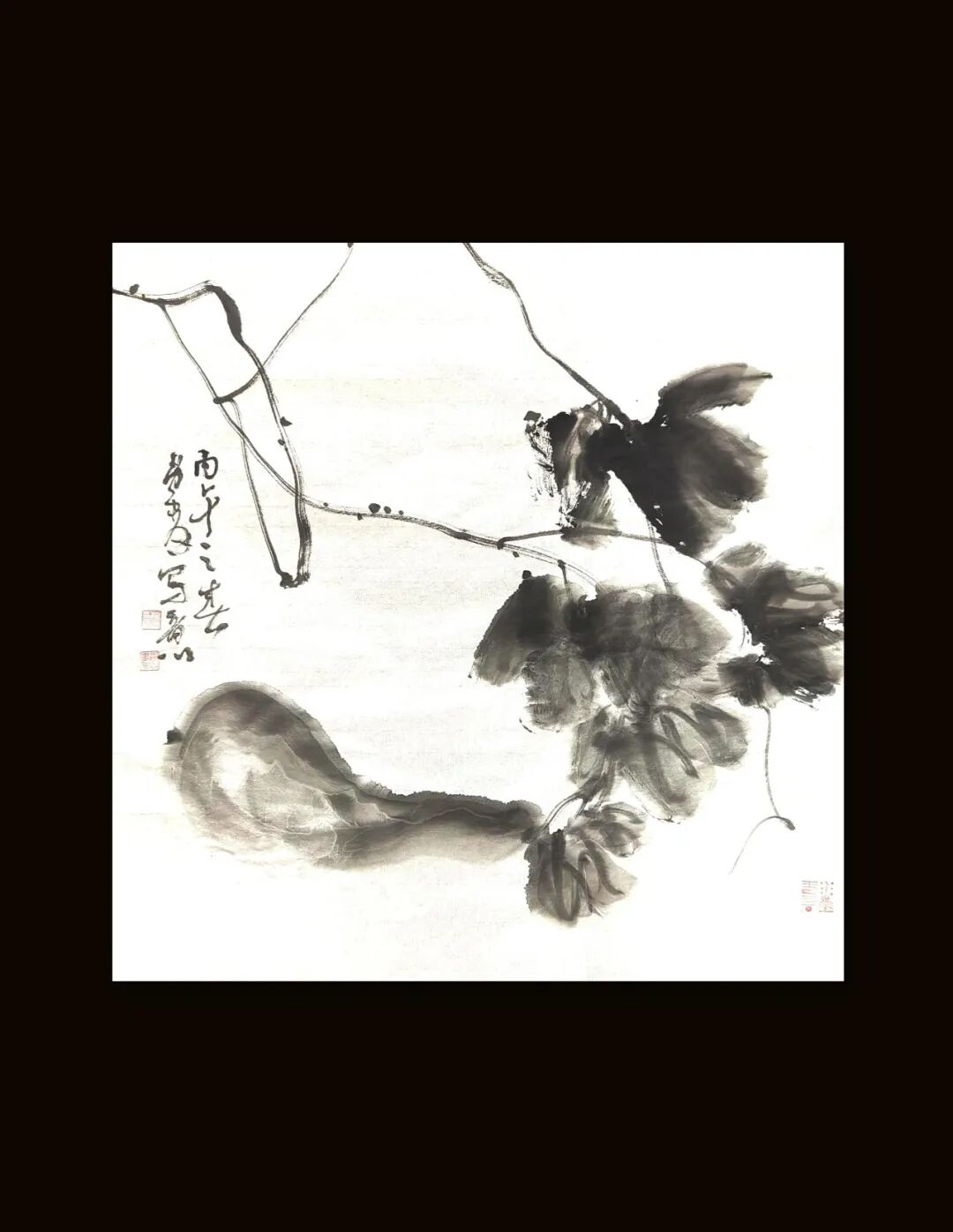 那段曾与父母种菜耕田的乡村岁月,是他艺术生命里的源头活水。晨曦里沾露的菜畦,暮色中归巢的飞鸟,藤蔓上悄然垂落的瓜果,田埂间随风摇曳的野花,这些扎根泥土的生命,以最质朴的姿态,在他心中刻下万物生长的密码。这份对自然的深刻体察,化作他笔下的笔墨语言——《香魂》红梅图里,老干如耕牛拓荒的遒劲,繁花似田埂野花的热烈,墨色浓淡间,是生命挣脱寒冬的倔强;《南瓜图》中,淡墨勾就的瓜形憨态可掬,浓墨点染的藤蔓舒展自在,一笔一画,皆带着蔬果从抽芽到成熟的鲜活气息;《兰石图》里,兰草柔韧如田埂细柳,湖石奇崛似乡间顽石,枯笔写意间,藏着“幽兰生于深谷,不以无人而不芳”的清逸。他笔下的“四君子”,从不是文人画的刻板摹写,而是带着泥土温度的生命礼赞;他绘的山水孤舟,亦不是遥不可及的桃源幻境,而是耕罢归来,坐看云起的田园闲情。
