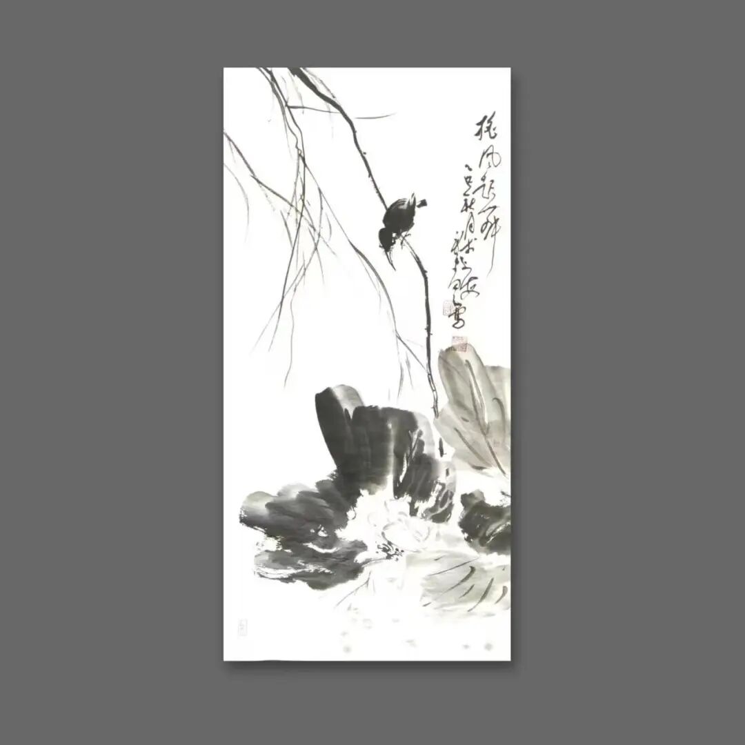 中国美术学院的专业学习,为他的笔墨注入了章法与气度,而游山玩水的写生之旅,则让他的艺术视野愈发开阔。他不爱喧嚣的名利场,独喜于空山幽谷间寻一处僻静,铺纸研墨,将奇峰怪石、流泉飞瀑纳入笔端;亦爱于江南水乡的烟雨中漫步,把白墙黛瓦、小桥流水的雅致,凝作水墨间的留白。这份与自然的朝夕相伴,让他的作品褪去了匠气,多了几分禅意——《孤舟山水》图中,淡墨晕染的远山如薄雾轻笼,一叶扁舟泊于江面,留白处似有水气氤氲,正是他静观山水时,心境与自然相融的写照;《鹰击长空》里,雄鹰展翅的豪迈,并非剑拔弩张的张扬,而是水墨泼洒间的气韵流动,藏着山巅观鹰时,对生命力量的敬畏。