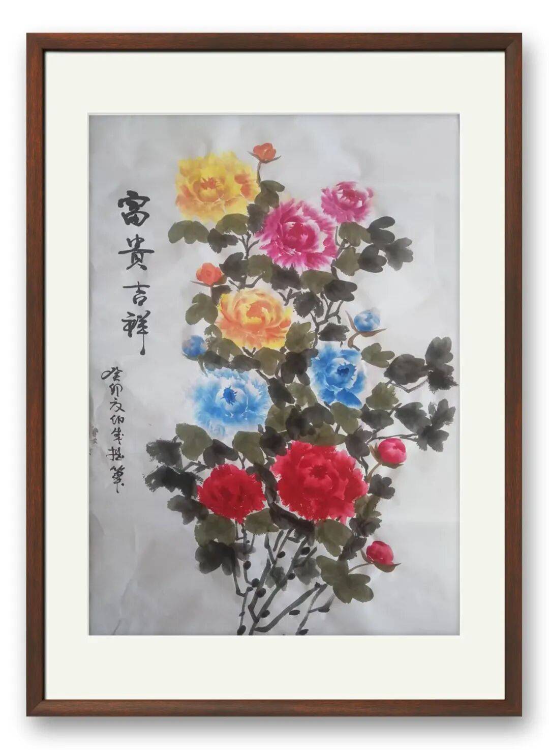 其画作以花鸟为媒,以心性为墨,将自然生灵的灵秀与生机定格于尺幅之间。牡丹历来是富贵吉祥的象征,却常被画得流于俗艳,而他笔下的牡丹,跳出程式化桎梏,尽显雅俗共赏之态。落笔从容,墨色浓淡相宜,花瓣层层叠叠、肌理分明,色彩清丽不张扬,淡墨勾筋、浓墨点韵,将牡丹的雍容华贵与清雅风骨完美融合,既见其端庄气度,又藏着对生命盛放的敬畏与赞颂。