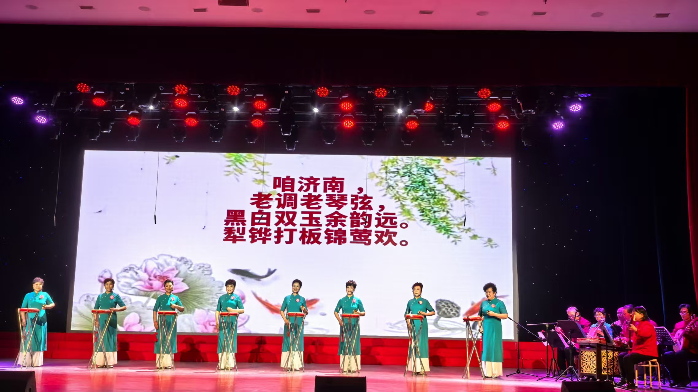 乡音的出场总是最勾魂摄魄的。一排京韵大鼓,月琴扬琴,还有那二胡吱呀呀一响,便将人拽回了大明湖畔、趵突泉边。山东大鼓《济南老曲调》,唱词里尽是“七十二泉”“曲水亭街”的旧时风物。表演者是清一色精神饱满、风姿依旧的老妪,只见她们双目有神,手指在鼓面上蜻蜓点水般掠过,流淌出的却是半部泉城的掌故。那调子古朴苍劲,像老槐树盘虬的根,紧紧抓着脚下的泥土。在现代化浪潮席卷一切的今天,这乡音便成了一座流动的、声音的“济南府”,在舞台右侧伴奏的几位银发老者,眯着眼睛,全神投入,完全沉浸在歌咏泉城的优美旋律中,微醺自得……
