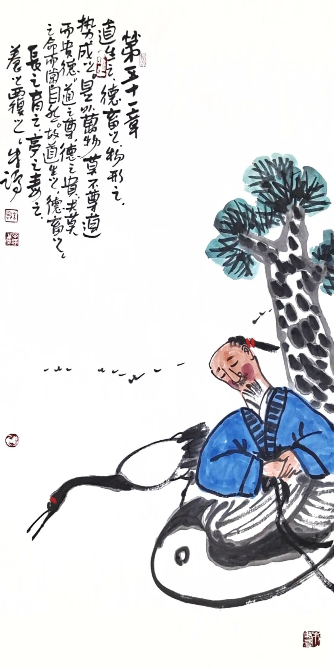 · 老子形象:不必写实,可用飘荡的衣袍、白须与背影象征智慧,面容模糊或融入自然。· 动物隐喻:用“谷神”(空谷)、“玄牝”(母性)等概念化形象,如画空洞的空间孕育万物,或墨点构成的鹤俯身饮水。
