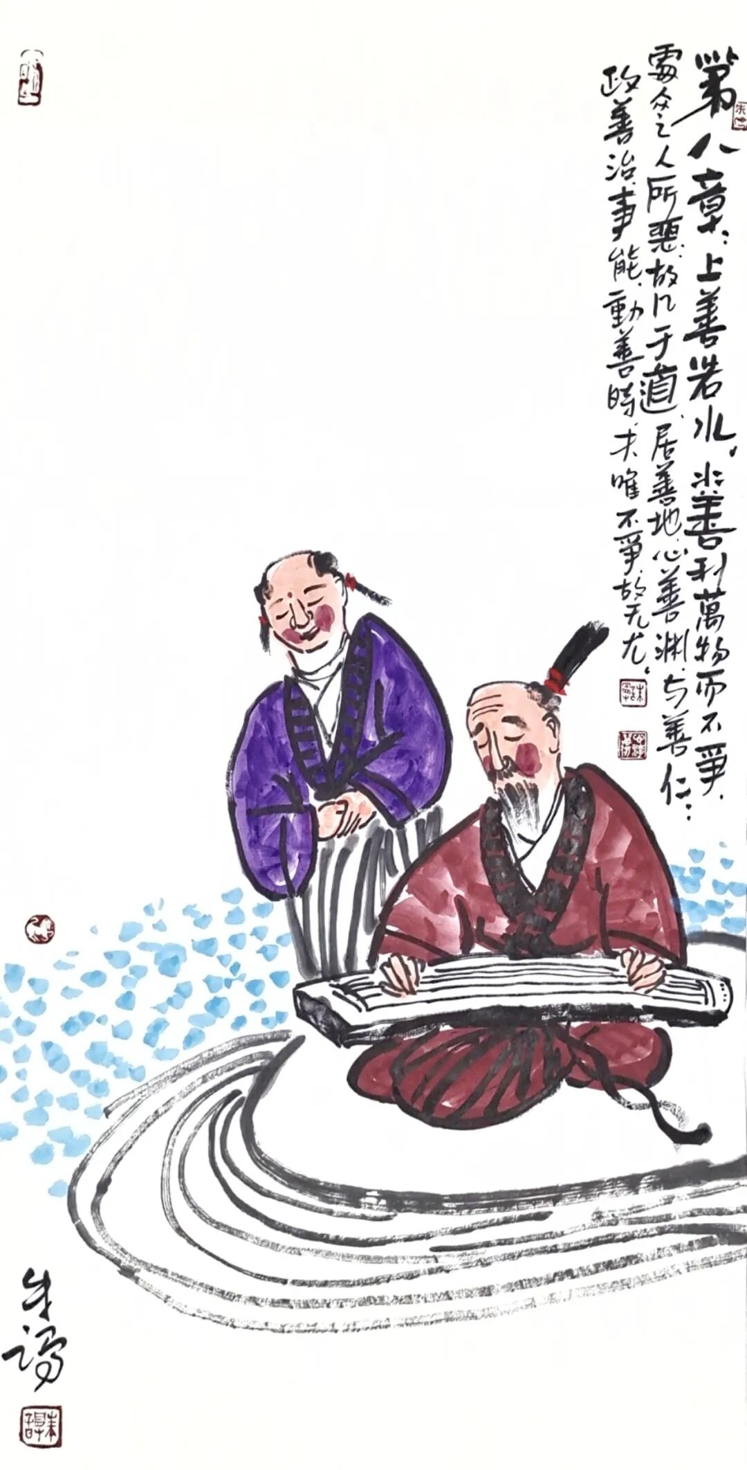 2、“上善若水”(第八章)· 表现方式:水墨渲染出水的柔性与力量,如水滴汇聚成江海,润木载舟(隐喻“利万物而不争”)。拟人化的水滴角色,形态随意变化,遇石则绕,遇洼则盈。