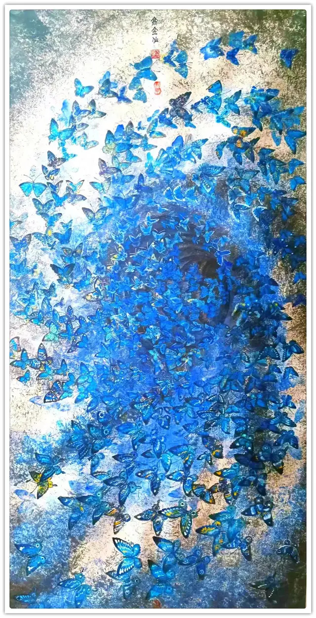 这幅画以深浅不一的蓝色蝴蝶汇聚成流动的漩涡,如同一片涌动的生命潮汐;