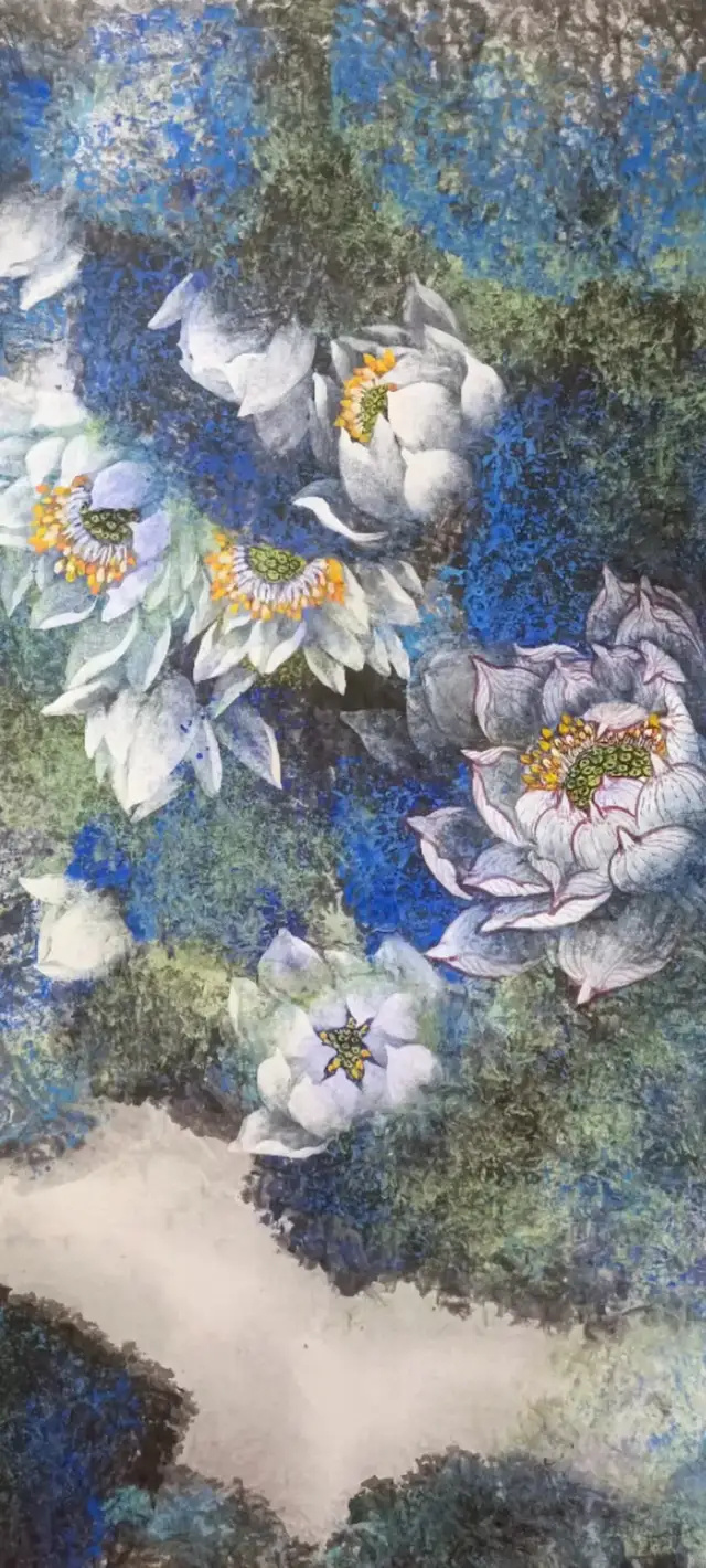 其三,抽象具象精妙平衡。《青花荷韵》以抽象蓝绿泼墨为底,具象白荷点缀其间,写意的奔放与写实的细腻浑然一体,实现了传统写意精神与当代抽象审美的完美融合。