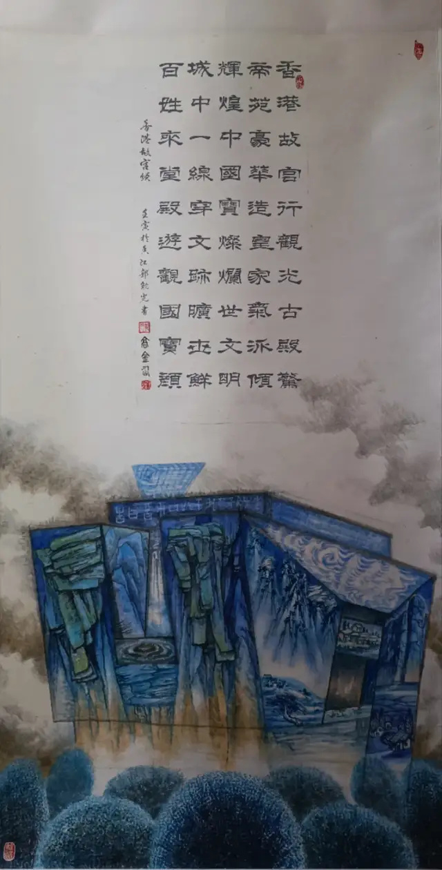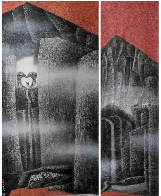 高金仙打破传统水墨题材的桎梏,将现代都市景观纳入创作视野。《都市地标》以摩天大楼为主体,将传统山水的红色山峦意象嵌入建筑立面,白鸽翩跹、抽象文字隐现,构建出“城市即山水”的当代哲思,让冰冷的都市建筑流淌出东方美学的温润气韵。《海蚀洞天》则以抽象灰色岩穴为视觉框架,框定沙滩碧海的写实景致,虚实相生间营造出“洞天观海”的诗意空间,暗含对人与自然和谐共生的深层叩问。