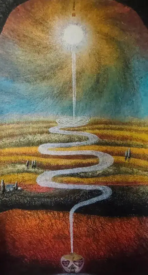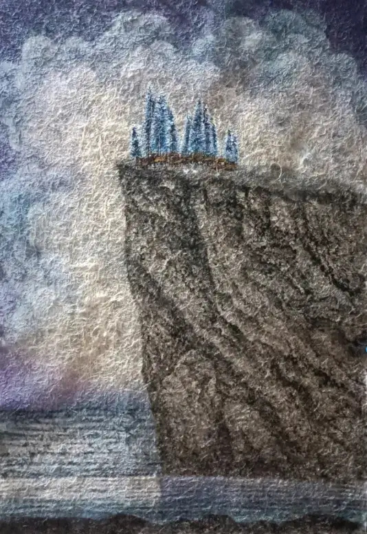这幅画以肌理对比营造强烈视觉张力:粗糙的岩石纹理用密集的线条堆叠出悬崖的厚重质感,而崖顶的蓝色尖顶建筑则以剔透的冷色调与锐利轮廓,在混沌的背景中脱颖而出。云雾的朦胧晕染与海面的细碎波纹,进一步强化了“孤悬于天地间”的悬浮感,让现实的崖壁与超现实的圣殿形成奇妙的平衡。