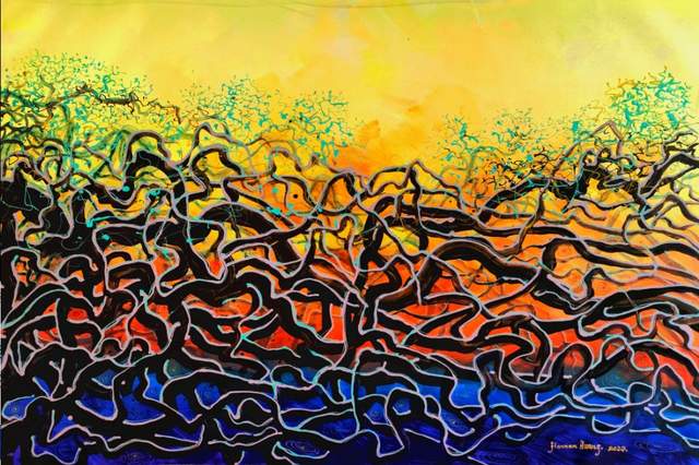 书法艺术的深度探索:其书法作品具有鲜明的“宇宙流形”风格,与绘画创作形成精神同构