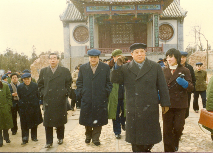 蓬莱阁景区优秀导游王玉梅(右一)给时任国家旅游局长韩克华(右二)讲解,中为蒋奎生,左二为国家旅游局局长何若泉