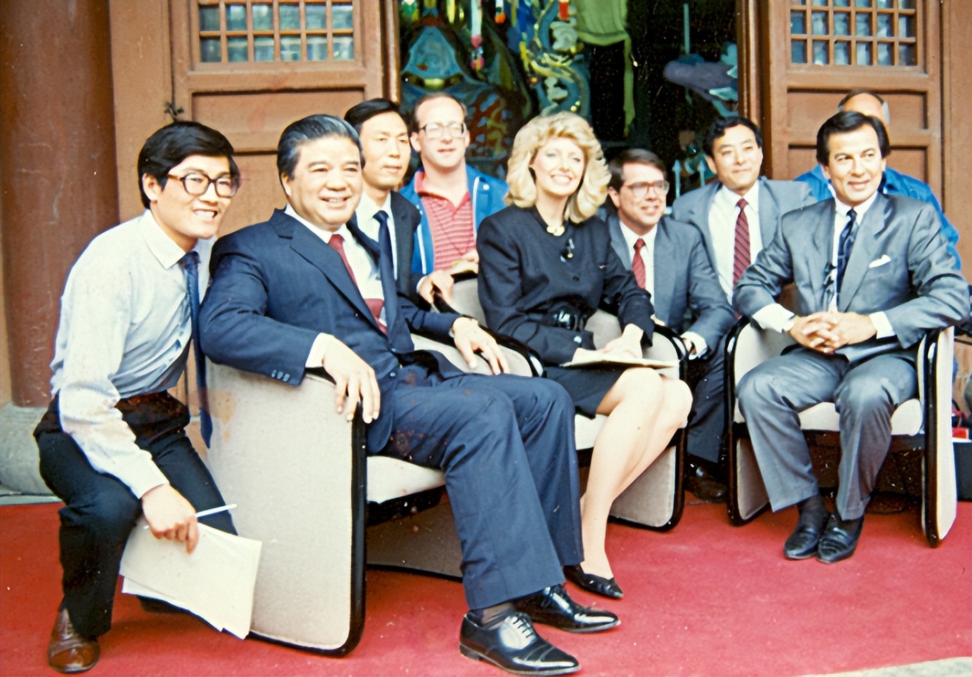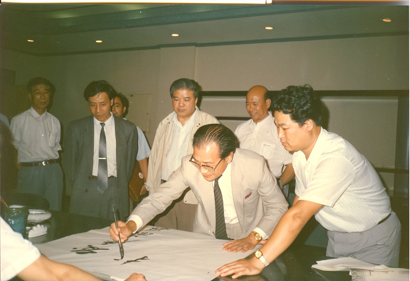 丁再献(右一)与时任国家旅游局局长刘毅(题字者)和山东省旅游局长蒋奎生(中)在一起1991.7
