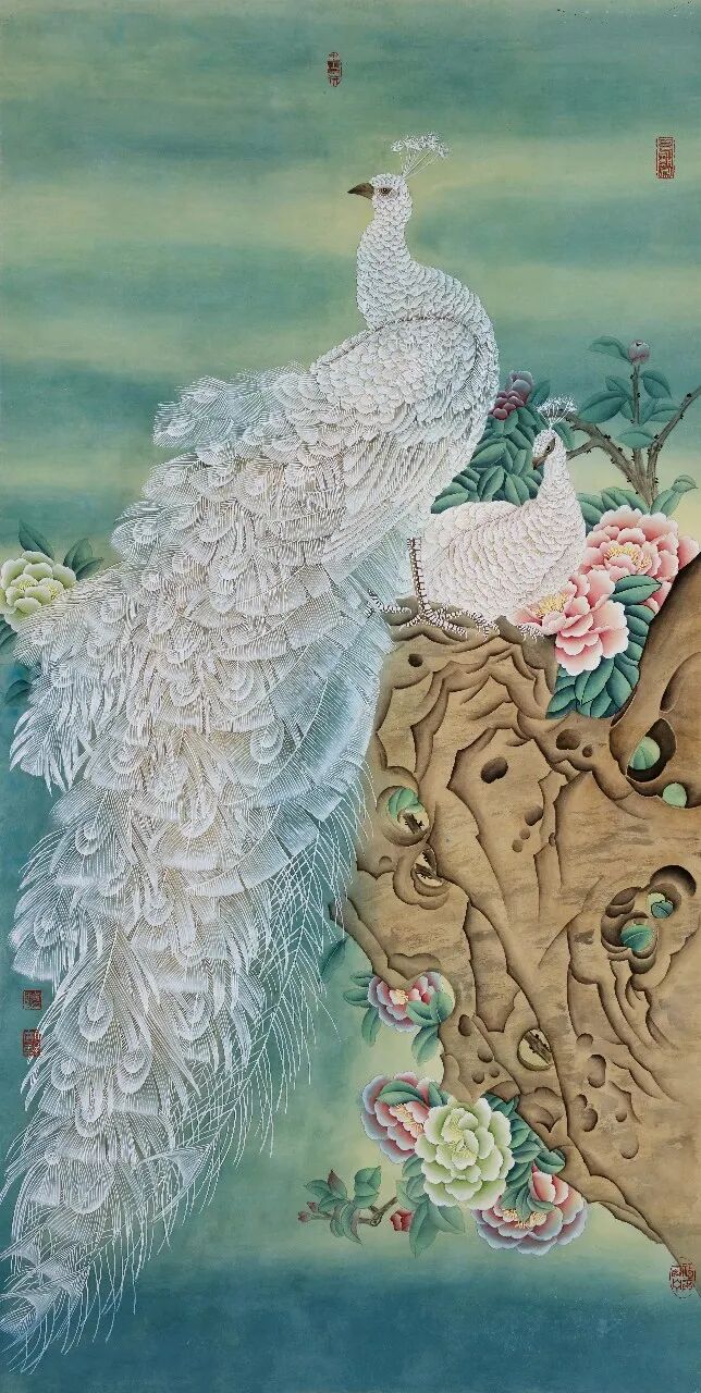 设色是其工笔花鸟最鲜明的艺术语言,她深耕传统矿物质颜料的运用,遵循“随类赋彩”的古训,以层层晕染的技法铺陈色彩。色彩浓郁饱满却不失雅致,重彩之中见清润,艳而不俗、浓而不腻,既保留矿物质颜料独有的厚重质感与古典韵味,又通过色彩的冷暖对比、浓淡过渡,营造出丰富的视觉层次;同时注重色与墨的交融共生,“色不碍墨、墨不掩色”,让色彩的艳丽与墨色的温润相互映衬,赋予画面深沉而高贵的艺术格调,让重彩成为传递东方美学精神的重要载体。