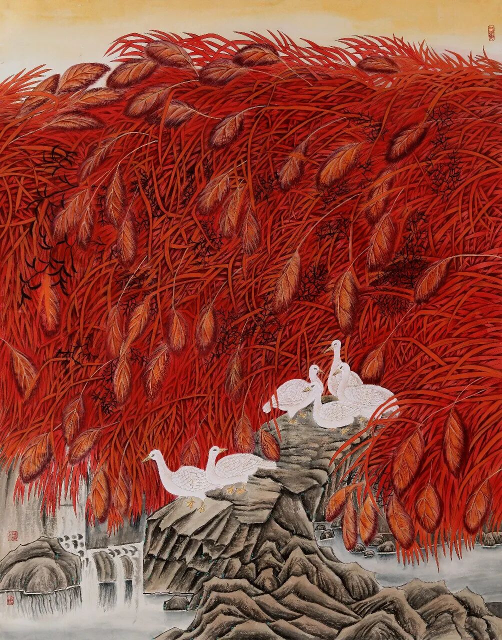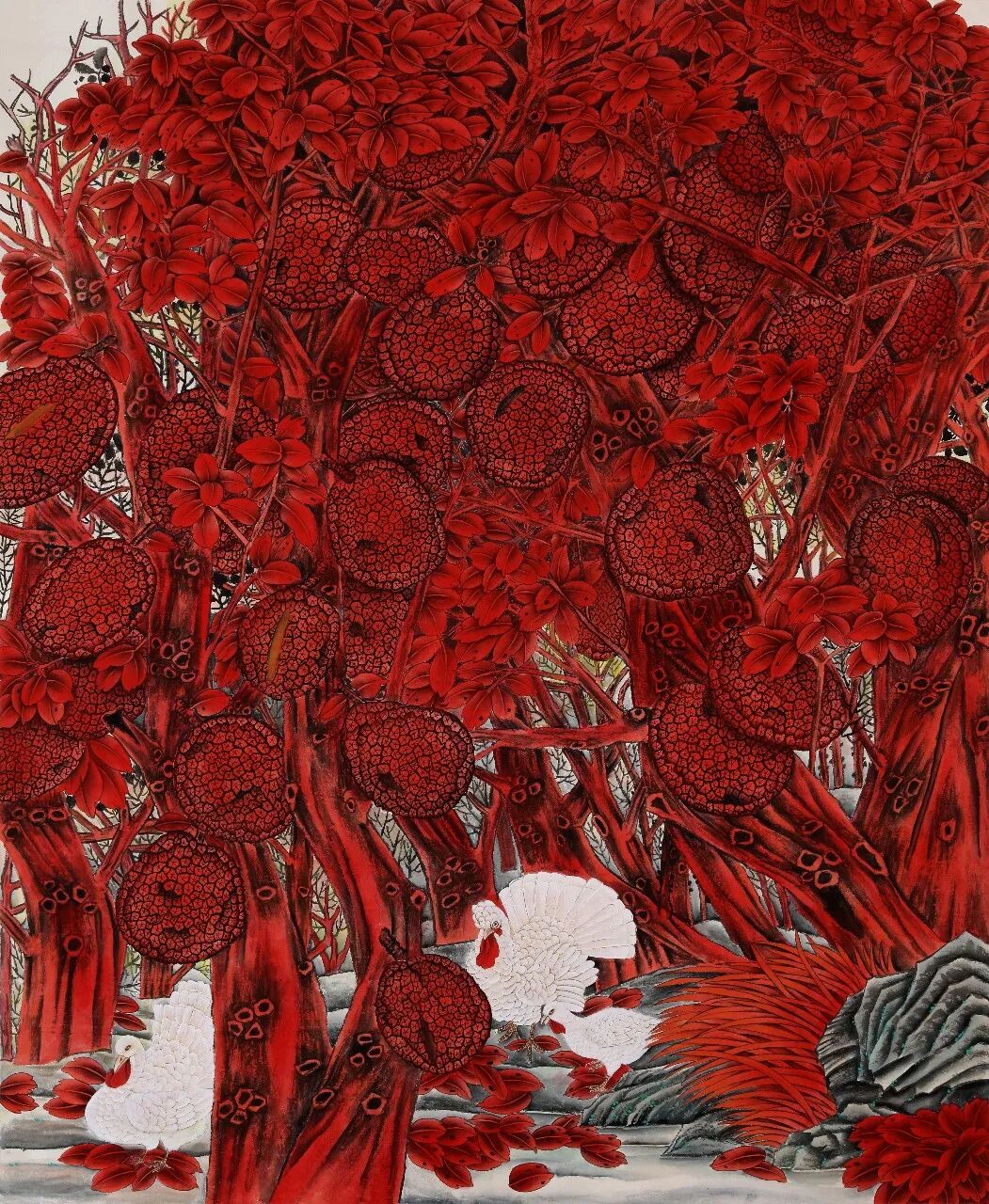 她的创作始终聚焦自然中的花鸟、禽鸟与草木,题材选取既涵盖承载传统吉祥寓意的经典物象,也捕捉自然生态里鲜活的草木禽鸟之态,不局限于单一物象的复刻,而是以当代审美视角重构传统题材,让笔下的花鸟既有东方文化的符号意蕴,又有贴近自然的生命质感,每一种物象都成为情感与精神的表达媒介,而非单纯的写生描摹。