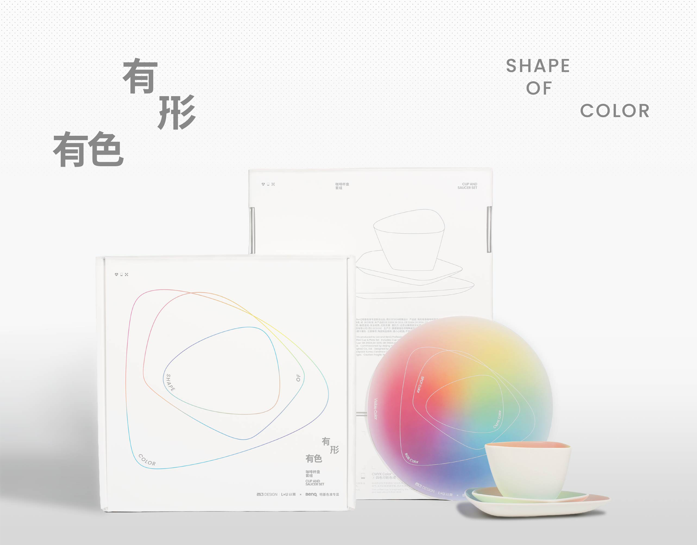 2026年1月,LxU以乘与显示器头部品牌BenQ明基联合打造的“有形有色”咖啡杯盘套装礼盒正式上线,由西3 DESIGN负责整体设计创作。该礼盒以“色域信息图表中的色彩逻辑”为灵感来源,将不同显色模式下的色彩范围与边界轮廓,转译为日常器物的造型语言,使抽象的信息结构转化为可被感知和使用的设计表达。