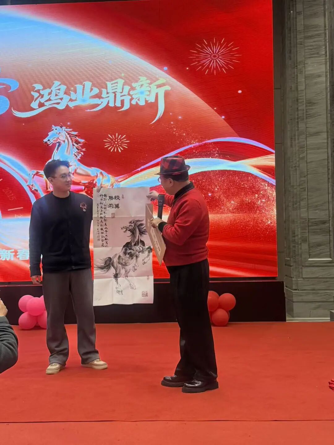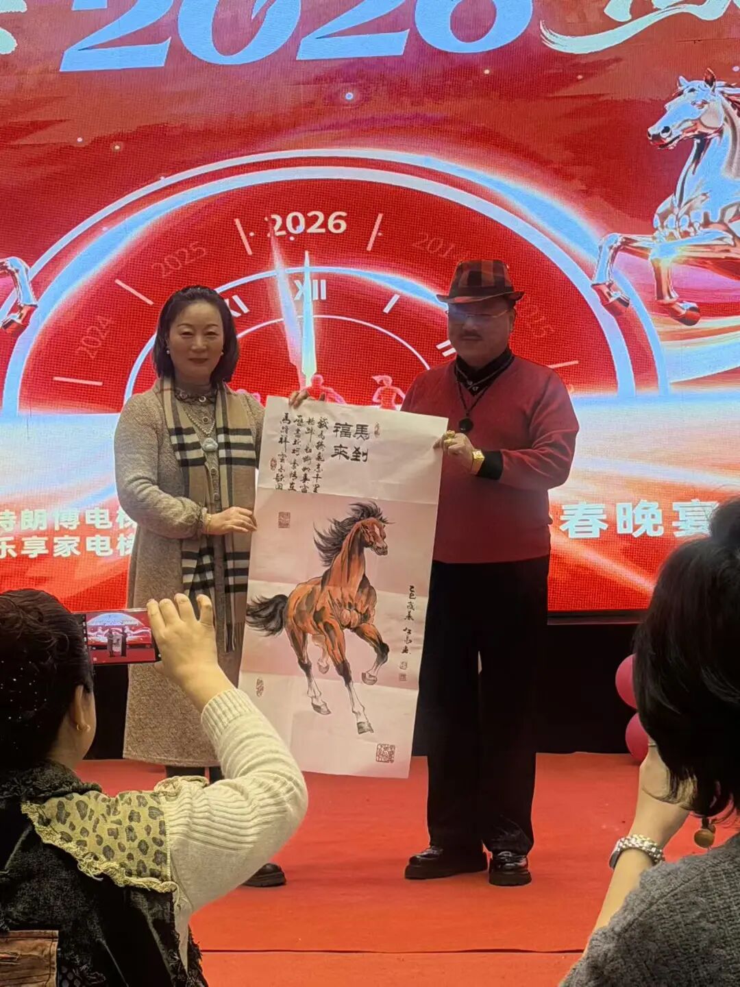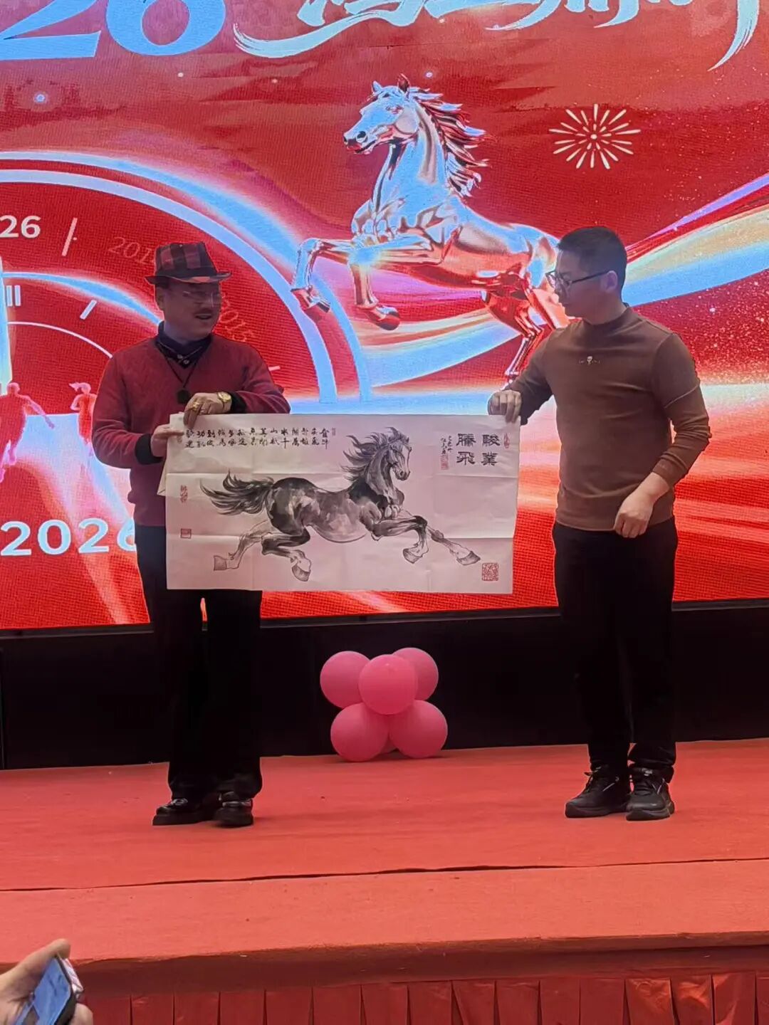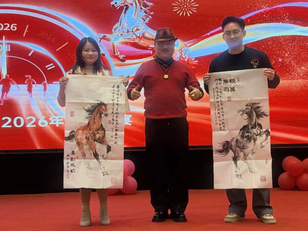 首先是董事长周勇先生对2025年度的工作总结,并表扬了一批先进工作者。公司艺术顾问,国家一级美术师江晨先生现场给优秀员工和最佳合作单位赠“马”送福。马到福来、一马当先、马踏祥云、马到成功。一切美好的祝愿尽在笔墨之中!晚宴期间,欢歌笑语。有公司员工登台高歌,也有专业戏曲演员现场表演。大家举杯祝愿:新年新气象,公司更辉!